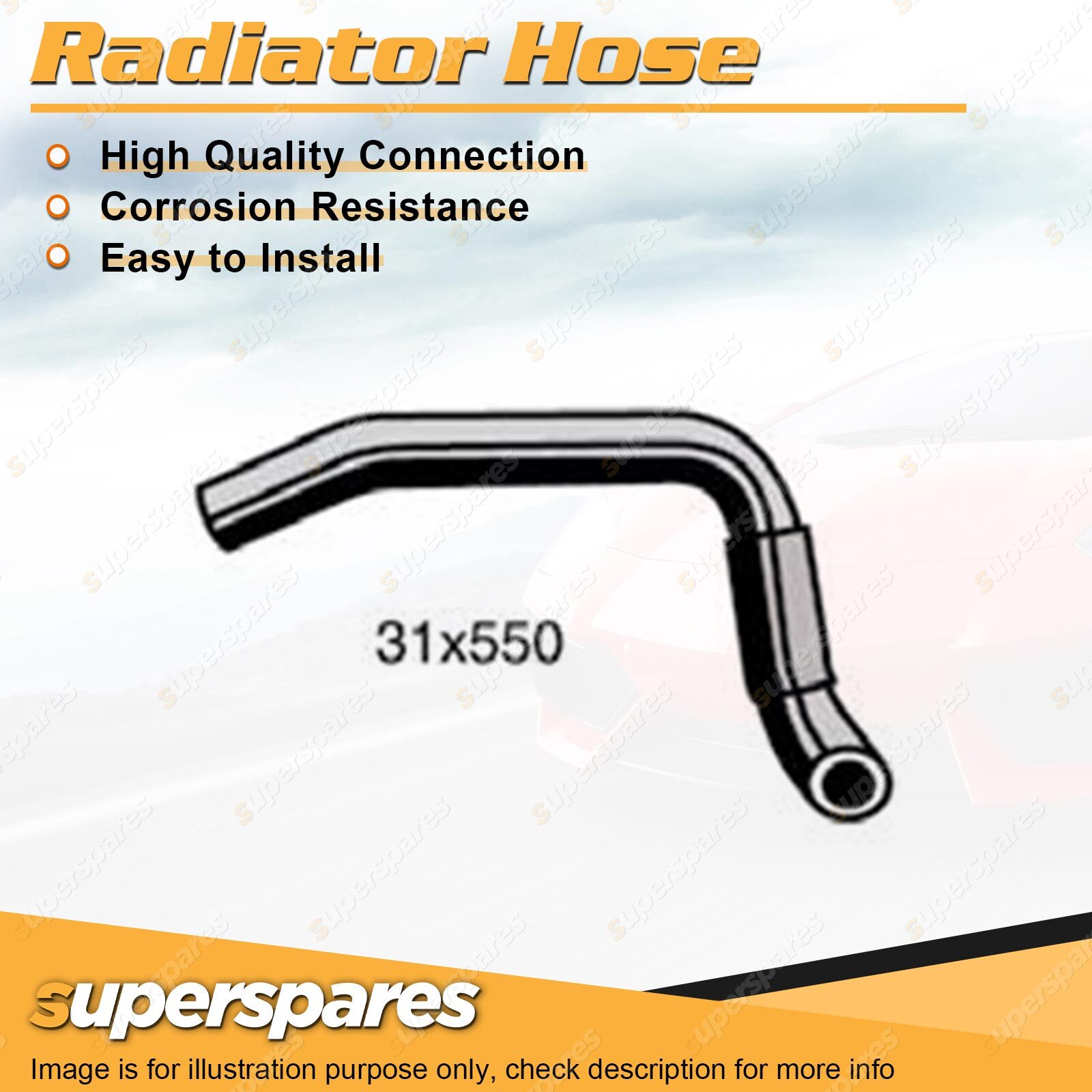 Content : 1 x Radiator Hose Brand : Superspares Position : Lower | Parameter : Length : 550mm Inside Diameter : 31mm |