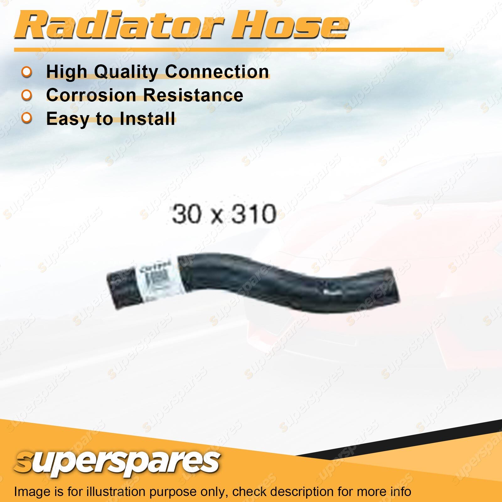 Content : 1 x Radiator Hose Brand : Superspares Position : Upper | Parameter : Length : 310mm Inside Diameter : 30mm |