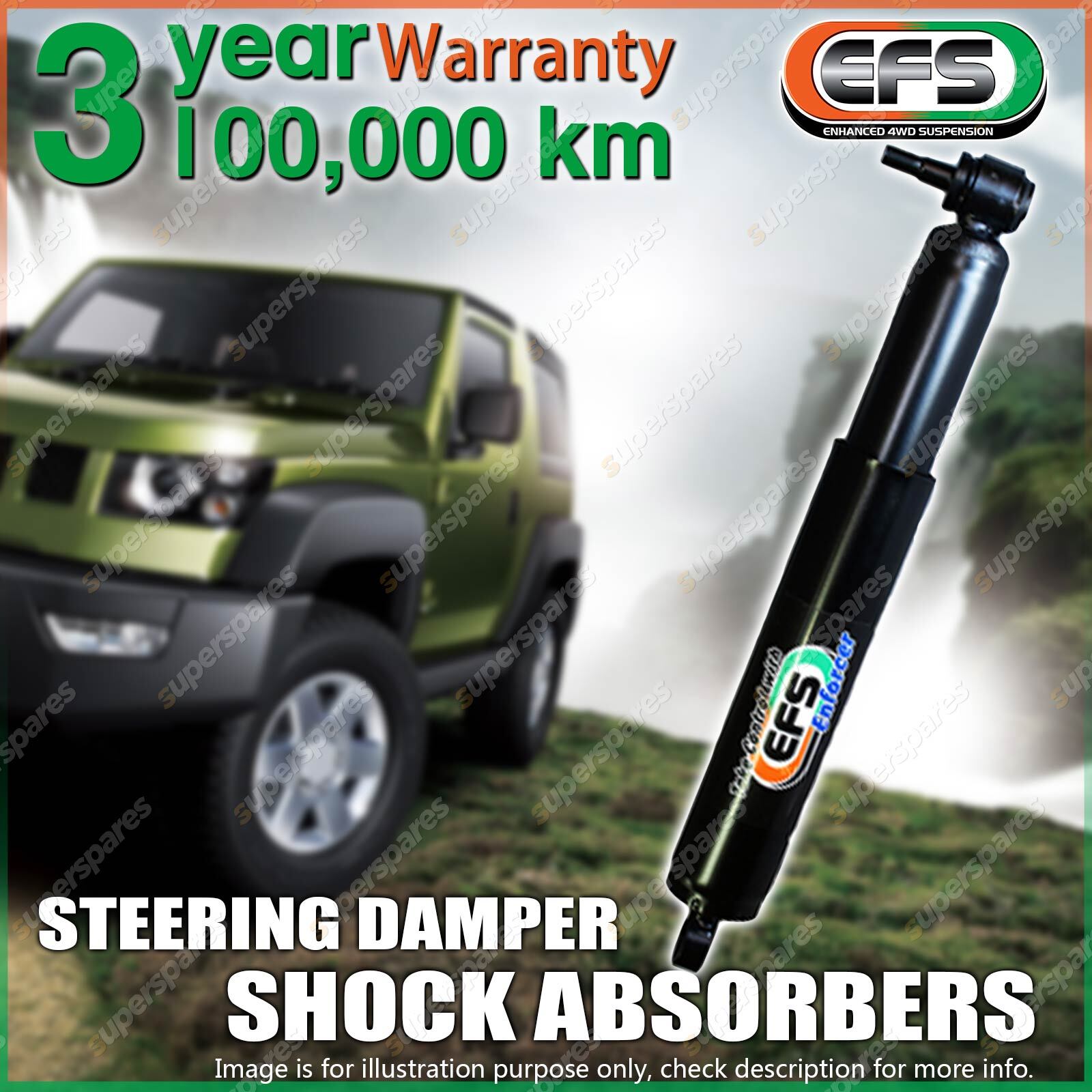 Enforcer Steering Damper The EFS Enforcer Steering Damper increases the control over bumper steer & improves steering control suited from standard to 33 inch tyres. Featuring 32mm twin tube, 11mm or 12mm hardened chrome piston rod, metal dust cover & gas cell technology. | X-Treme Steering Damper The EFS X-Treme Steering Damper will provide unmatched steering control and reliability. Designed with increased valve forces to aid in the control of oversized tyres that increase bump steer. Features 35mm bore, oversized 60mm body, 16mm hardened chrome shaft & increased valve forces to suit 33 - 37 inch tyres.