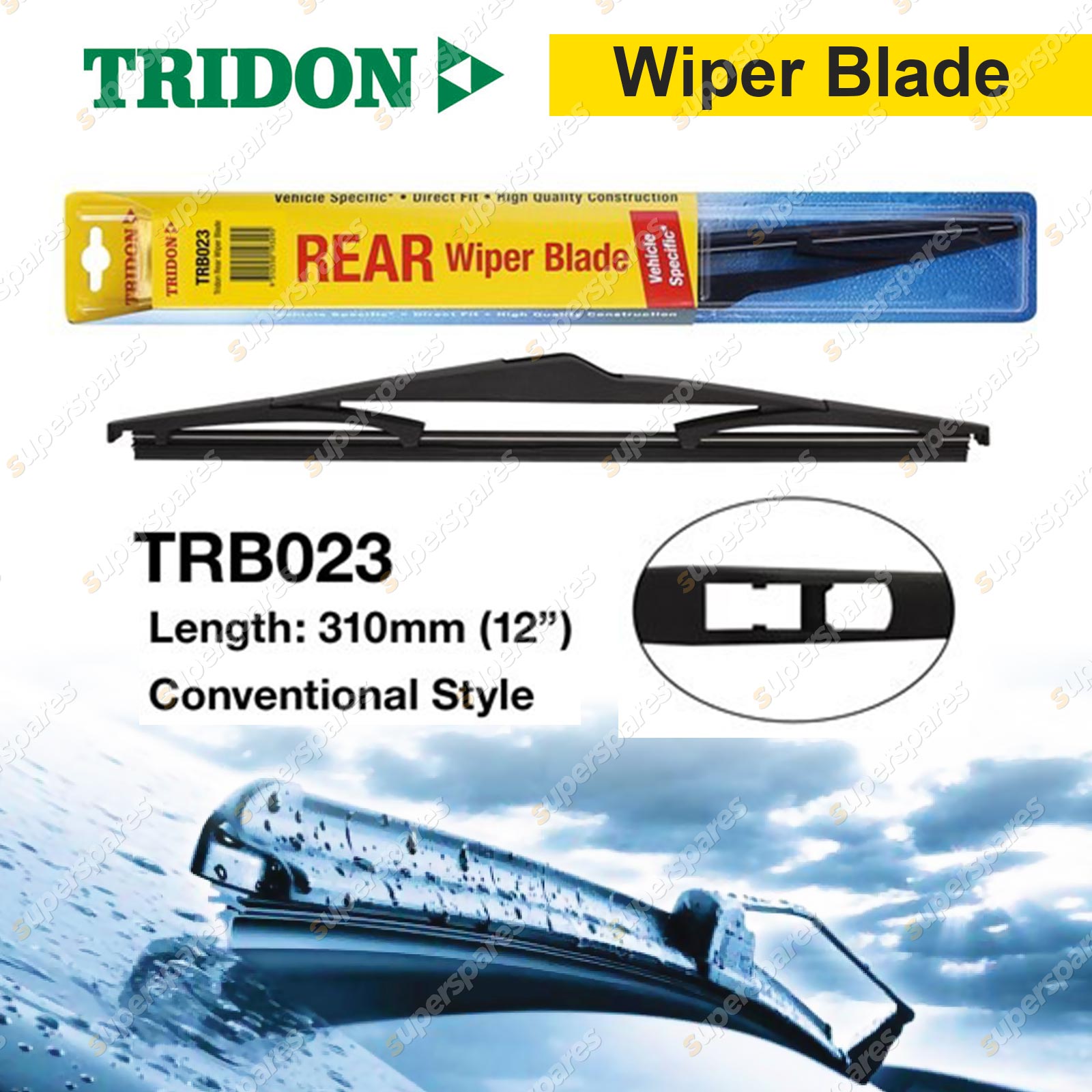 Content : Tridon Conventional Plastic Wiper Blade Position : Rear Length : 310mm (12") |
