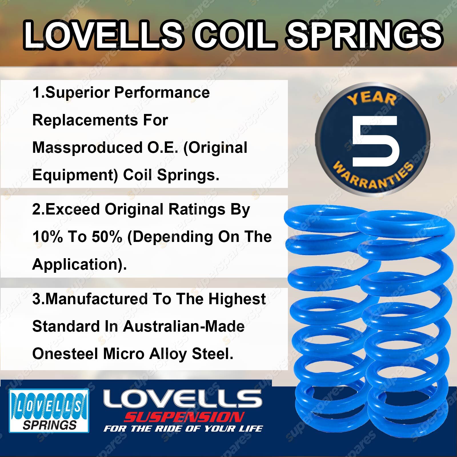 Lovells Coil Springs are proudly Australian made and utilises OneSteel micro alloy technology to provide optimal performance for your vehicle. After fitment you can expect improved stability while carry load or towing, superior ride control and outstanding comfort for both on-road and off-road driving. |