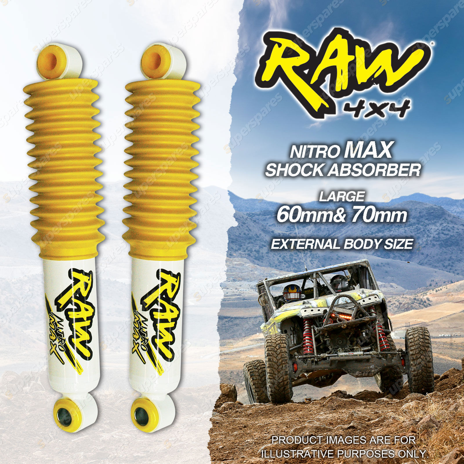 (*please advise year model, so we can make sure send you the right parts) Australia's terrain is some of the most diverse and demanding in the world. This is why it is essential your 4x4 is equipped with the right suspension components. If you are considering fitting load bearing aftermarket accessories, travelling prolonged periods on corrugated tracks or just want to improve the performance of your 4WD you need to upgrade your suspension. Nitro Max RAW 4? Nitro Max is the heavy weight contender of our shock absorber range. Nitro Max Utilising a large 60 mm body, the Nitro Max strut significantly increases oil capacity over the OE strut allowing you to go longer, further & harder.