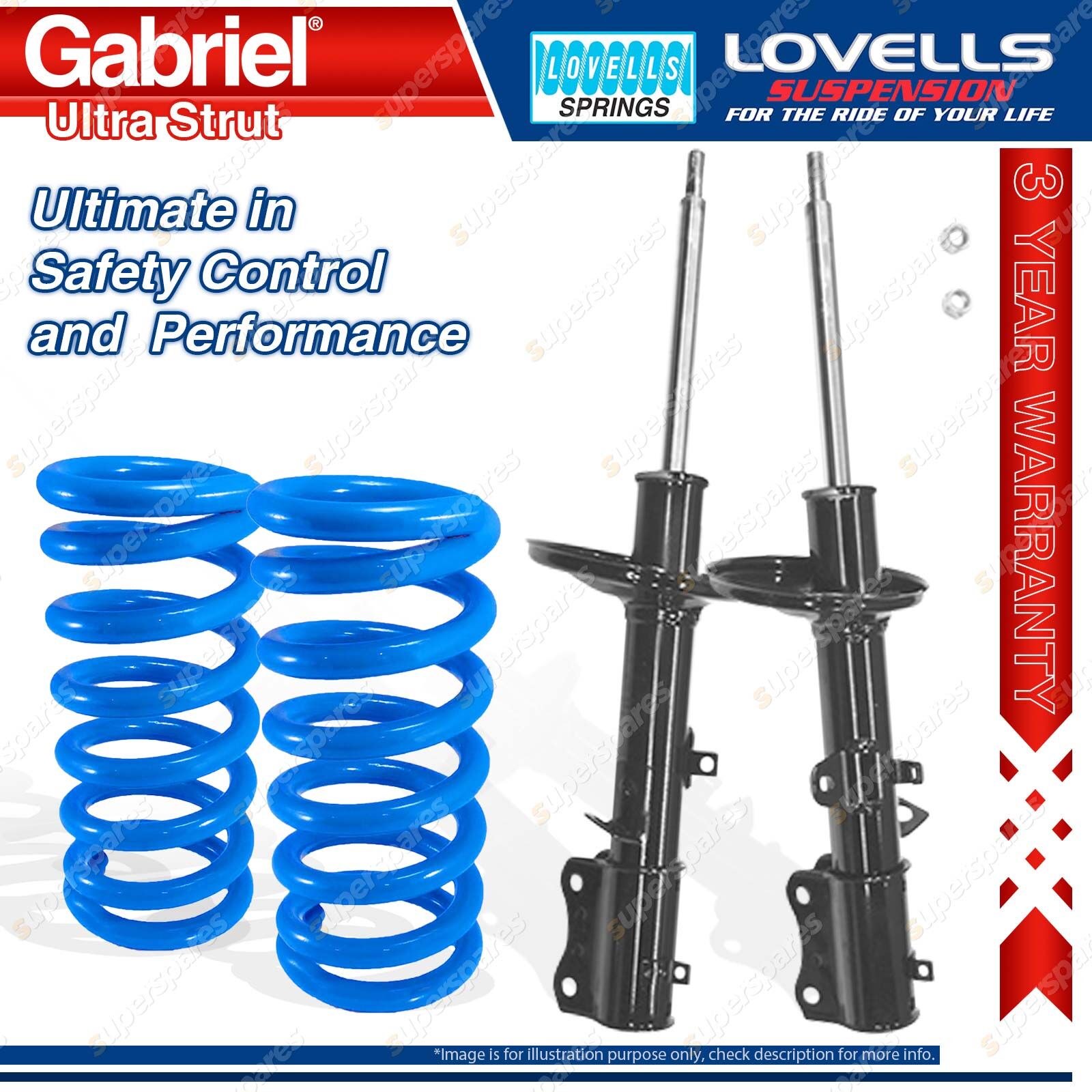 Contents: 2 x Gabriel Ultra Strut Shock Absorbers - Gas 2 x Heavy Duty Standard Height Lovells Springs Suit: Toyota Corolla AE112 1.8L Sedan, Hatch, Liftback 9/94-11/01 |