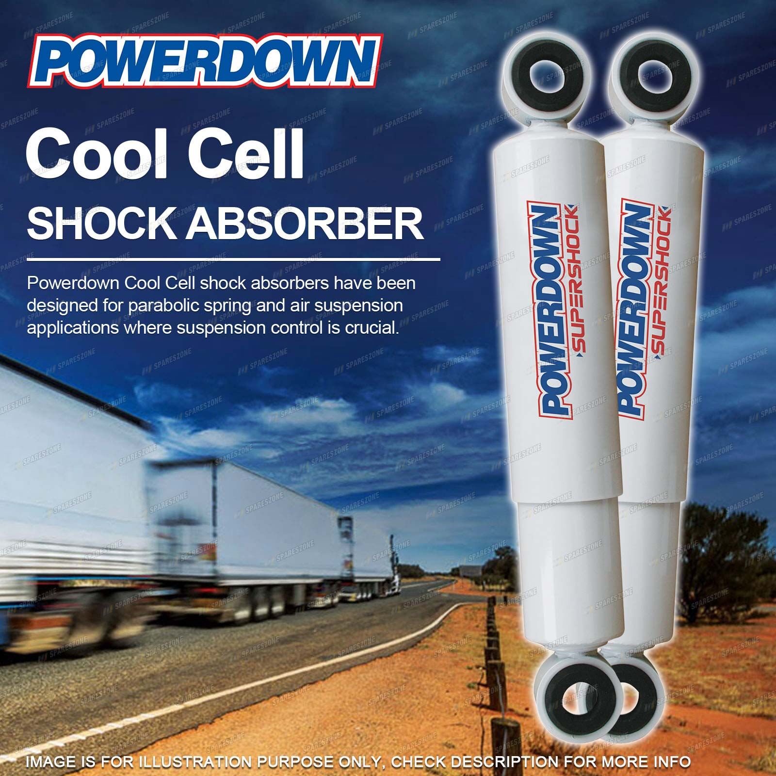 Description : Powerdown Front Shock absorber Brand : Powerdown Quantity In Package : 2 Product Type : COOL CELL Vehicle Type : TRUCK Top Mounting : EYE MOUNT Bottom Mounting : EYE MOUNT |