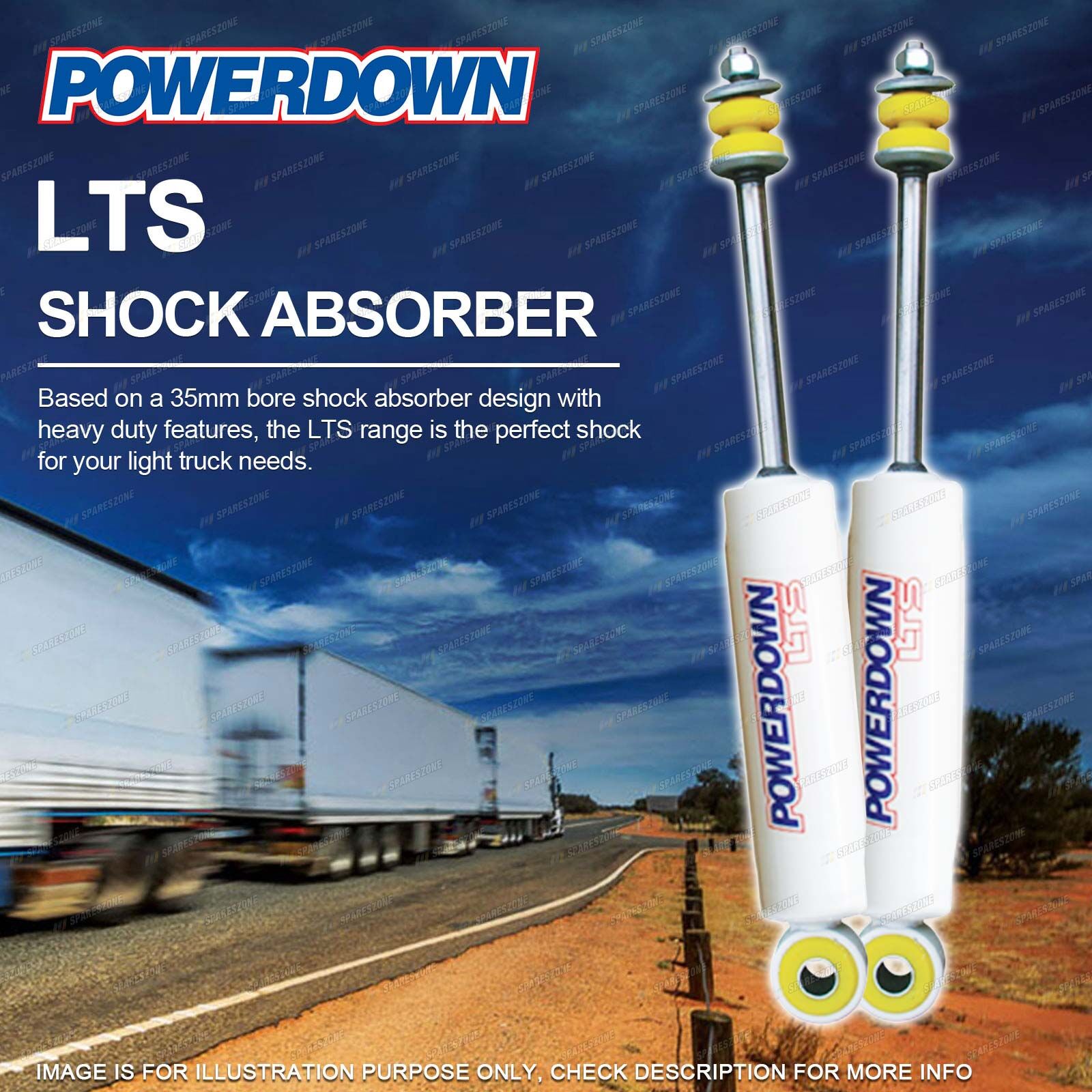 Description : Powerdown Front Shock Absorbers Quantity In Package : 2 Product Type : LTS Vehicle Type : Truck Top Mounting : Pin/Stud Bottom Mounting : Sleeved Eye |