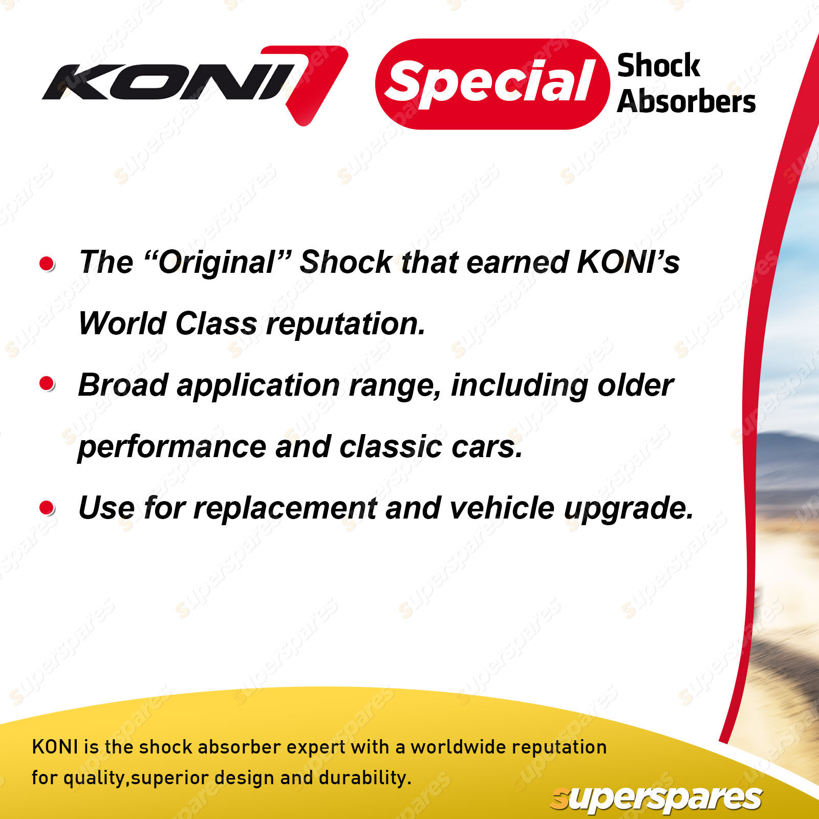 KONI Special shock absorbers are developed using state of the art technology and designed on the original innovative KONI design principles. |