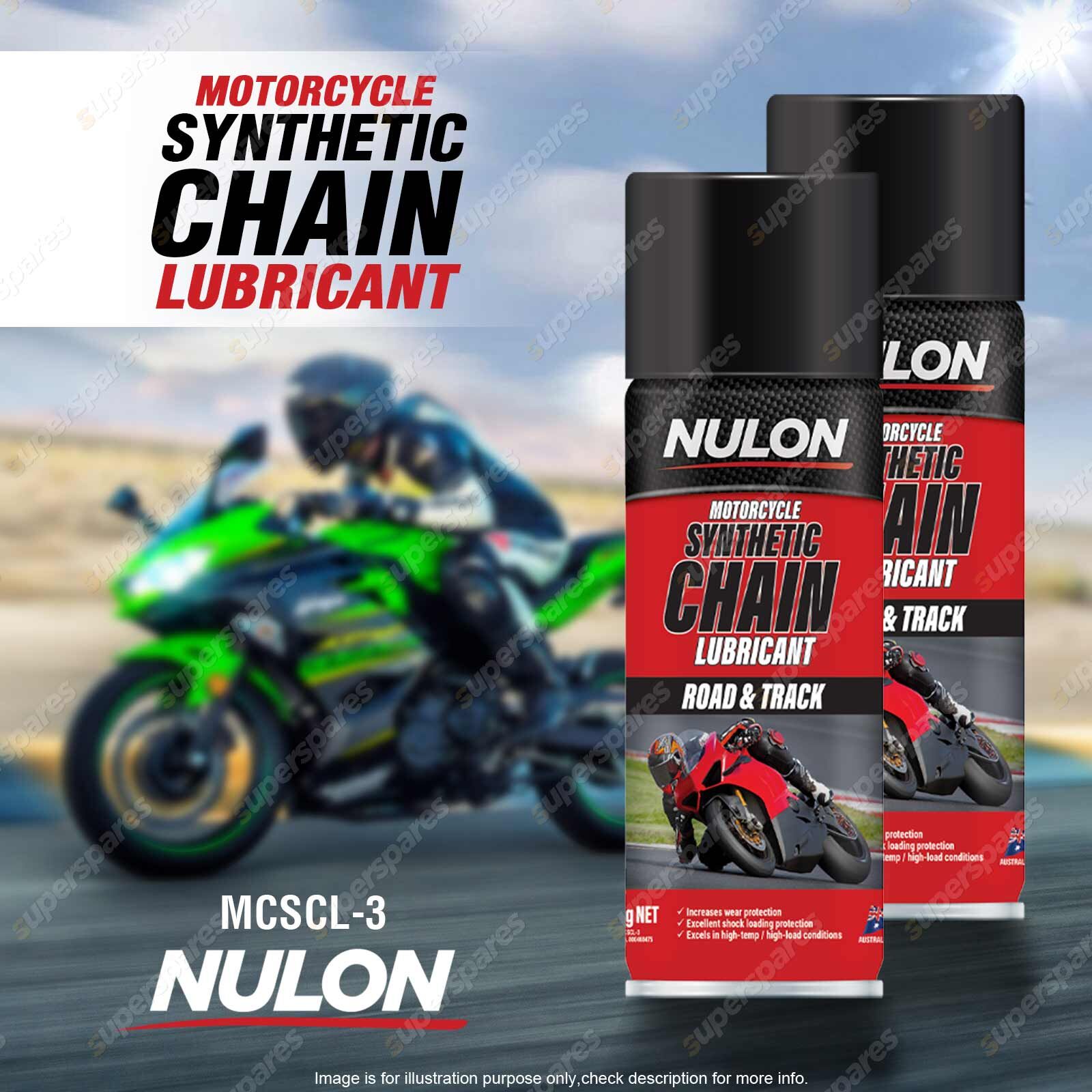 Nulon Motorcycle Synthetic Chain Lubricant is a transparent, thin film formulation for racing and high performance applications. The fast-drying formula provides maximum resistance against fling-off and allows for optimal re-lubrication in both everyday and high performance applications. Its advanced synthetic components provide excellent boundary lubrication, resulting in reduced friction and wear. It is suitable for all chains, including "O," "X," and "Z" ring types.