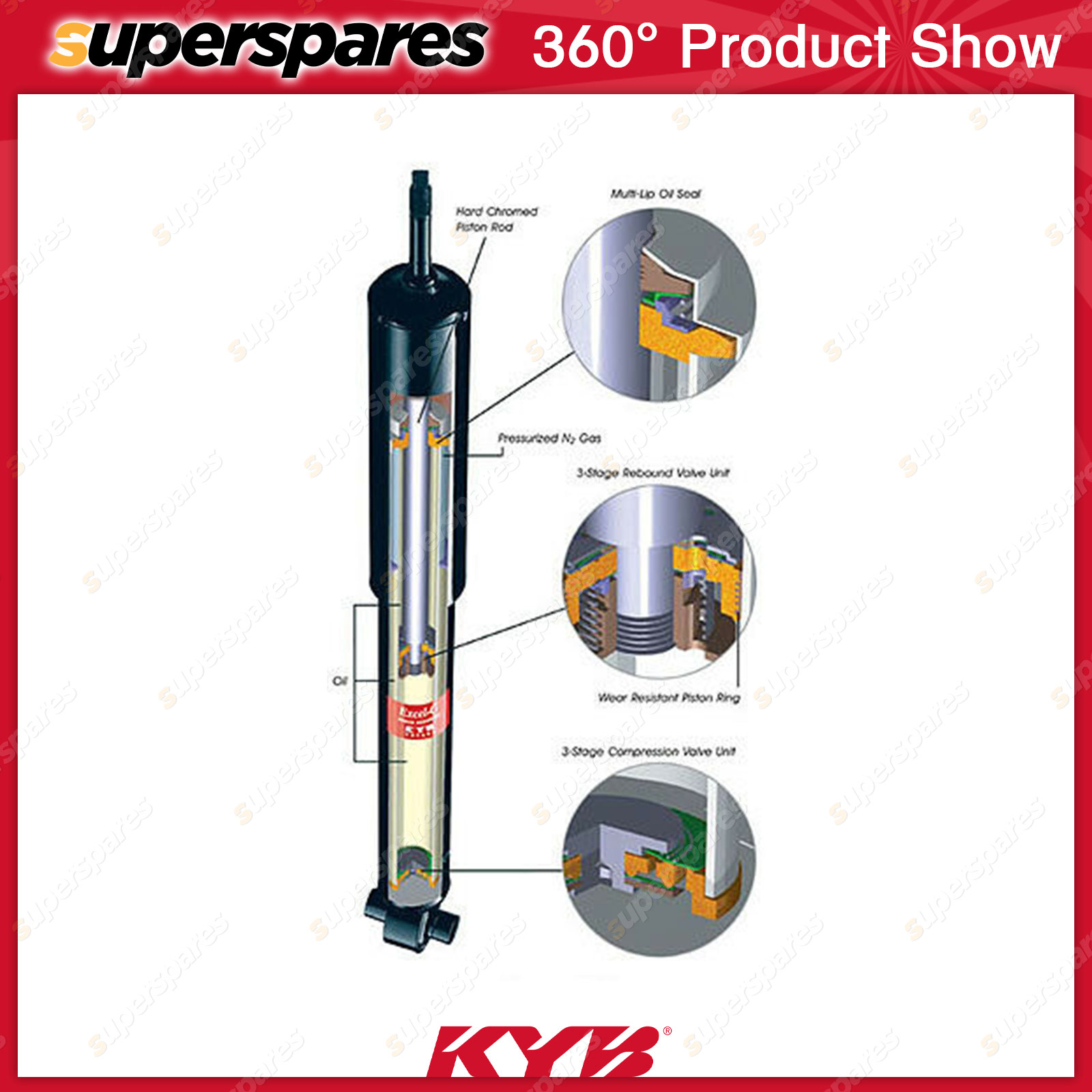 Outstanding features include: * Protective shell to keep out dirt. * Multi-lip seal to reduce possibility of oil leakage. * Sintered iron rod guide to extend life of shock absorber. * Pressurized nitrogen gas to reduce foaming and aeration, deliver better performance. * Hard-chromed piston rod to reduce friction. * Seamless cylinder to reduce possibility of splitting. * 3-stage rebound valving to give better control. * Sintered iron piston to add strength. * Wear resistant piston ring to reduce friction & leakage. * All weather fluid. * Seamless eye ring to reduce possibility of breakage | ![]() |