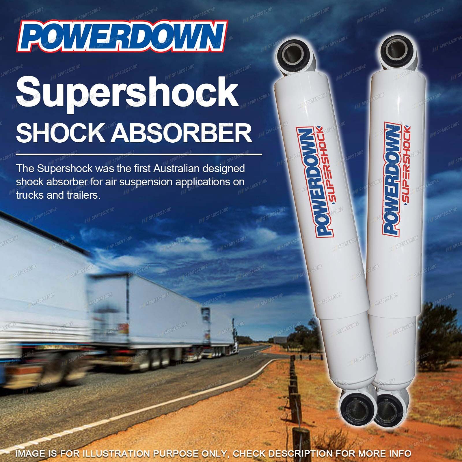 ![]() | SUPERSHOCK SHOCK ABSORBER The Supershock was the first Australian designed shock absorber for air suspension applications on trucks and trailers. Combining the following heavy duty features the Powerdown Supershock will provide the ultimate protection for your truck & trailer against road vibration damage and achieve the best possible life for your tyres. ♦ Large bore sizes–41 mm, 45 mm & 52 mm; ♦ Increased oil capacity vastly improving the shock absorbers ability to dissipate heat and operate cooler over long distances and constant high speeds; ♦ Upgraded dampening forces for our roads and higher horsepower engines, unlike products designed for Europe or North America; ♦ Viton seal & high temperature oil to withstand higher operating temperatures longer, outlasting standard oils and rubber seals; ♦ 360° welds & one piece eye rings for increased strength and durability. |