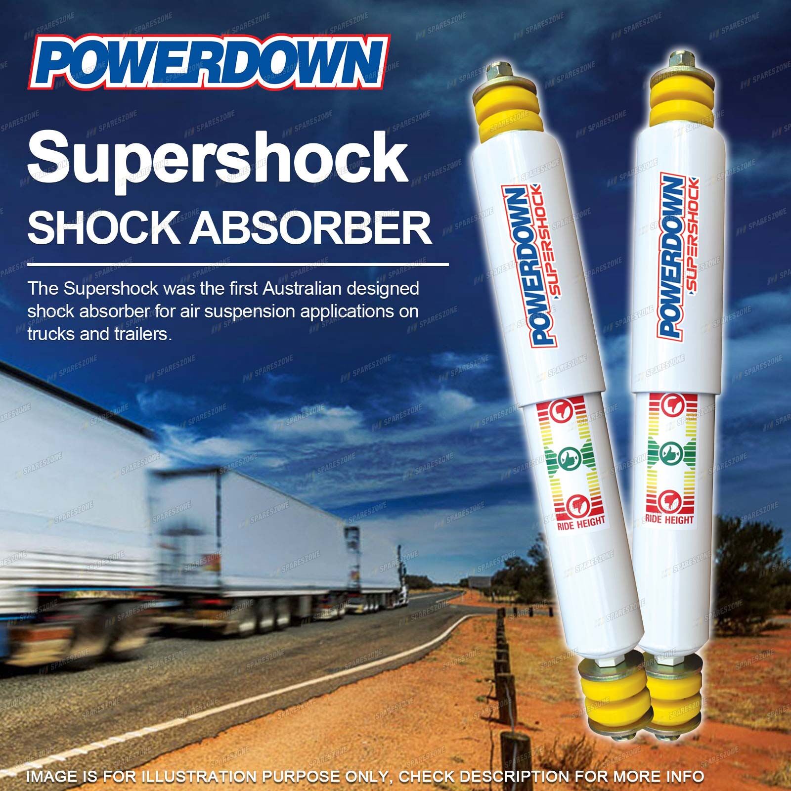 ![]() | SUPERSHOCK SHOCK ABSORBER The Supershock was the first Australian designed shock absorber for air suspension applications on trucks and trailers. Combining the following heavy duty features the Powerdown Supershock will provide the ultimate protection for your truck & trailer against road vibration damage and achieve the best possible life for your tyres. ♦ Large bore sizes–41 mm, 45 mm & 52 mm; ♦ Increased oil capacity vastly improving the shock absorbers ability to dissipate heat and operate cooler over long distances and constant high speeds; ♦ Upgraded dampening forces for our roads and higher horsepower engines, unlike products designed for Europe or North America; ♦ Viton seal & high temperature oil to withstand higher operating temperatures longer, outlasting standard oils and rubber seals; ♦ 360° welds & one piece eye rings for increased strength and durability. |
