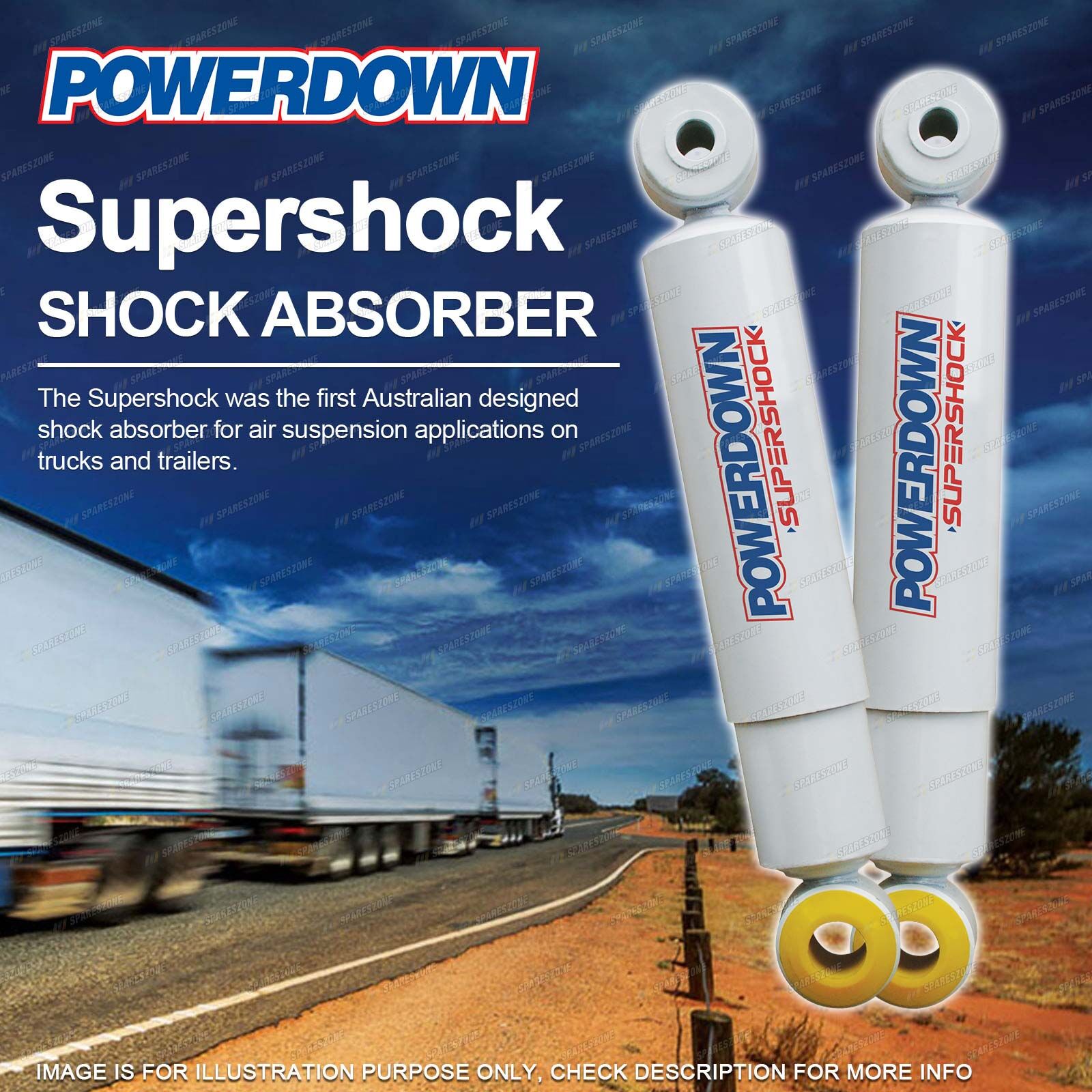![]() | SUPERSHOCK SHOCK ABSORBER The Supershock was the first Australian designed shock absorber for air suspension applications on trucks and trailers. Combining the following heavy duty features the Powerdown Supershock will provide the ultimate protection for your truck & trailer against road vibration damage and achieve the best possible life for your tyres. ♦ Large bore sizes–41 mm, 45 mm & 52 mm; ♦ Increased oil capacity vastly improving the shock absorbers ability to dissipate heat and operate cooler over long distances and constant high speeds; ♦ Upgraded dampening forces for our roads and higher horsepower engines, unlike products designed for Europe or North America; ♦ Viton seal & high temperature oil to withstand higher operating temperatures longer, outlasting standard oils and rubber seals; ♦ 360° welds & one piece eye rings for increased strength and durability. |
