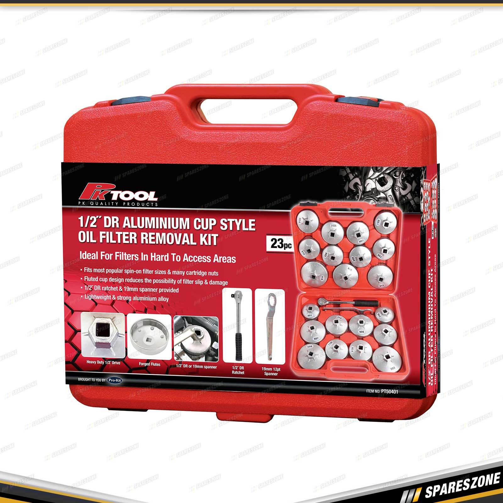 Contents : 23 Pcs of PK Tool 1/2" Dr Aluminium Cup Style Oil Filter Removal Kit