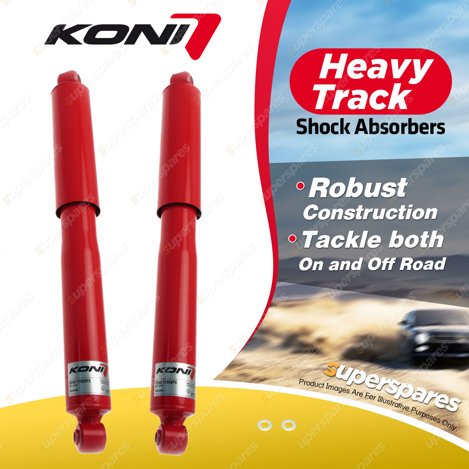 KONI Heavy Track shocks are specially developed for the on-road and off-road challenges of pick-ups, 4x4s, and SUVs. |