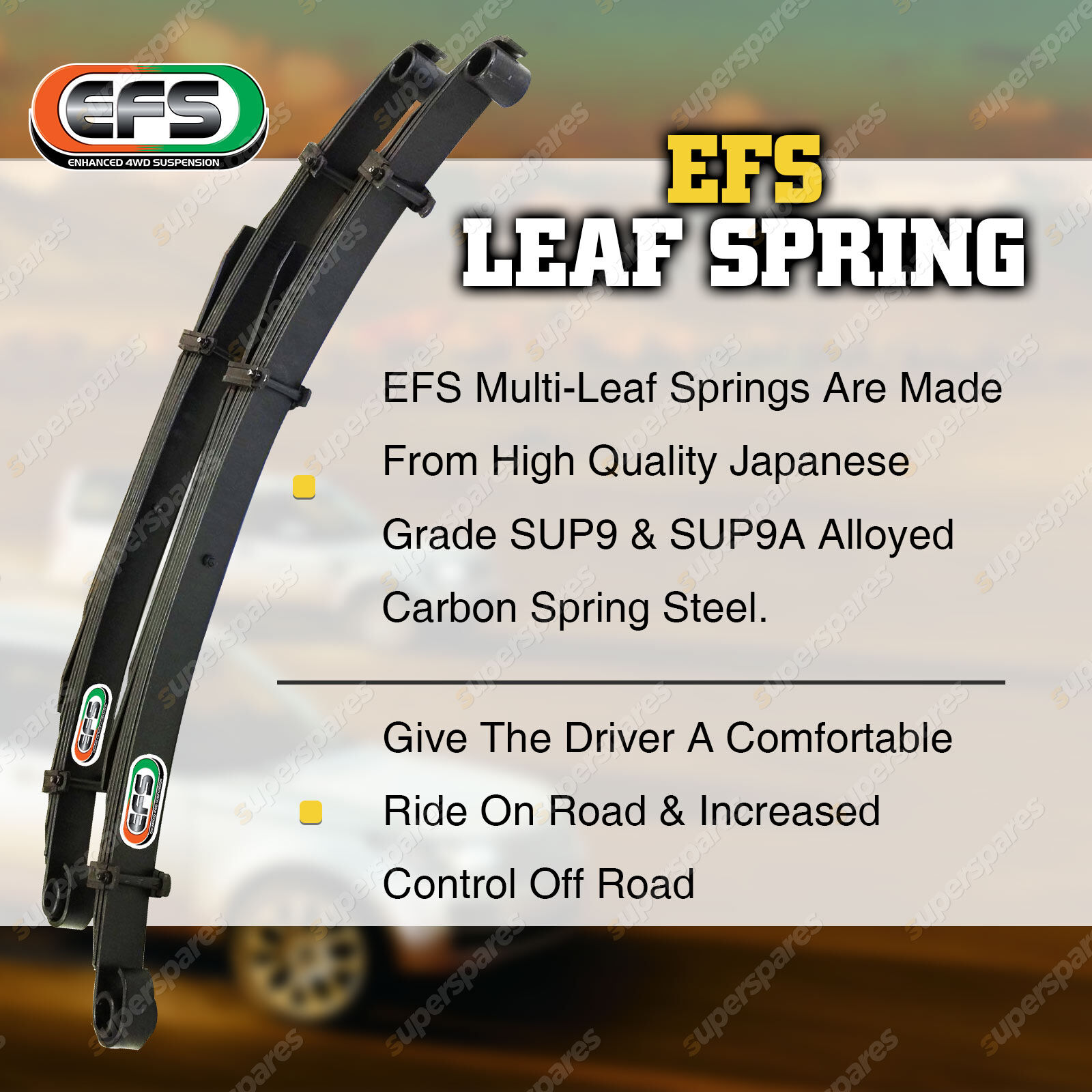 EFS Multi-Leaf Springs are made from high quality Japanese grade SUP9 & SUP9A Alloyed Carbon spring steel.Designed as a heavy duty load carrying spring with many load carrying capacity options. Guaranteed to transform your rigid leaf spring vehicle into a comfortable off-road performer. |