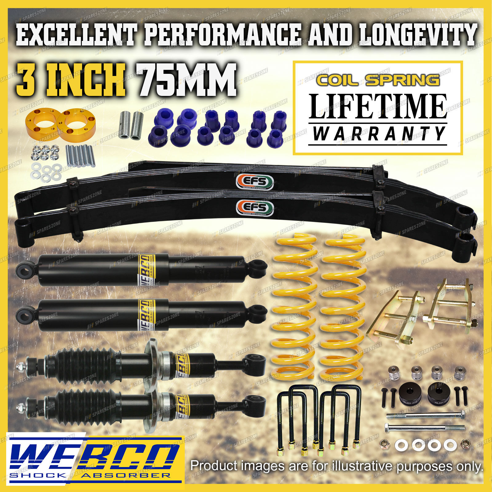 As car enthusiasts ourselves we completely understand the need for only wanting the best top quality aftermarket parts for your vehicle from a reliable and trustworthy source. We have utilised our understanding of this need to develop the best quality lift kits and build strong relationships with out valued customers; here's how... eBay have listed us as a "Top Rated Seller" with a 99.4% Positive feedback rating. We also offer a 30 day change of mind return period with a 100% fitment guarantee to ensure your peace of mind. Spareszone's lift kits offer an immense improvement in suspension performance and comfortability when compared to the standard stock suspension of your vehicle giving our customers a greater driving experience on and off road. |