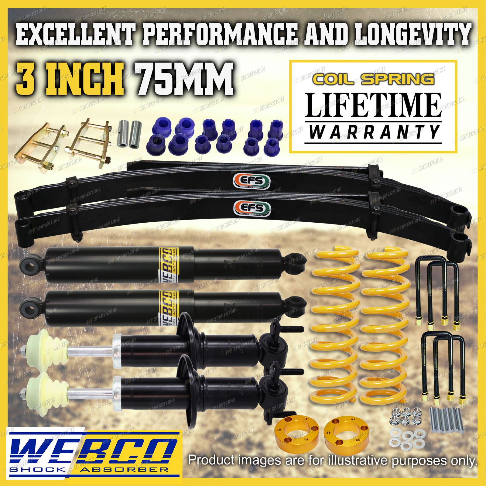 As car enthusiasts ourselves we completely understand the need for only wanting the best top quality aftermarket parts for your vehicle from a reliable and trustworthy source. We have utilised our understanding of this need to develop the best quality lift kits and build strong relationships with out valued customers; here's how... eBay have listed us as a "Top Rated Seller" with a 99.4% Positive feedback rating. We also offer a 30 day change of mind return period with a 100% fitment guarantee to ensure your peace of mind. Spareszone's lift kits offer an immense improvement in suspension performance and comfortability when compared to the standard stock suspension of your vehicle giving our customers a greater driving experience on and off road. |