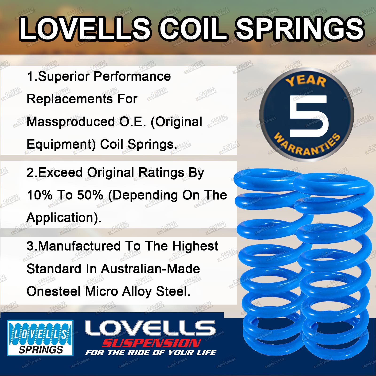 Lovells Coil Springs are proudly Australian made and utilises OneSteel micro alloy technology to provide optimal performance for your vehicle. After fitment you can expect improved stability while carry load or towing, superior ride control and outstanding comfort for both on-road and off-road driving. |