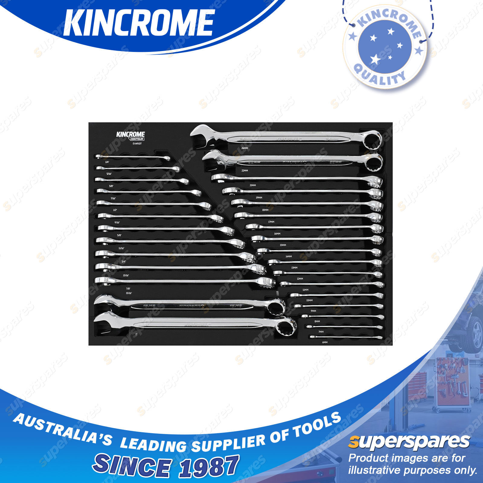 Contents : 30 Pcs of Kincrome Contour Combination Spanners EVA Tray