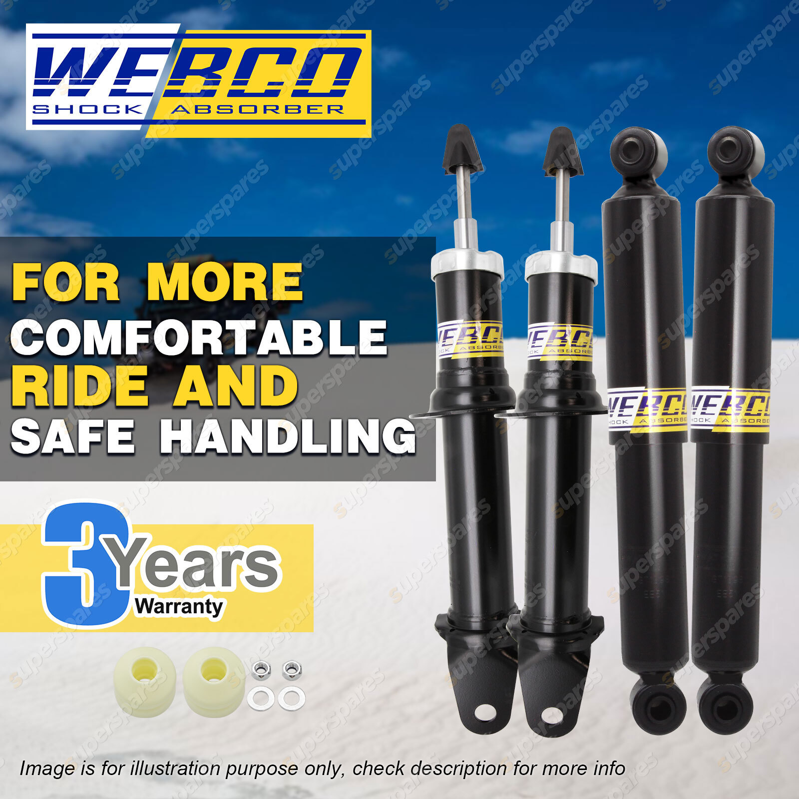 CONTENTS: 2 Pcs Front Webco Spring Seat Strut Shock Absorbers 2 Pcs Rear Webco Heavy Duty Shock Absorbers SUITS: FORD FALCON & FAIRMONT BF Series II Futura Fairmont Ghia Sedan Aug-07 - Apr-08 FORD FALCON & FAIRMONT BF Series II XR6 XR8 Sedan Aug-07 - Apr-08 (*please advise year model, so we can make sure send you the right parts) |