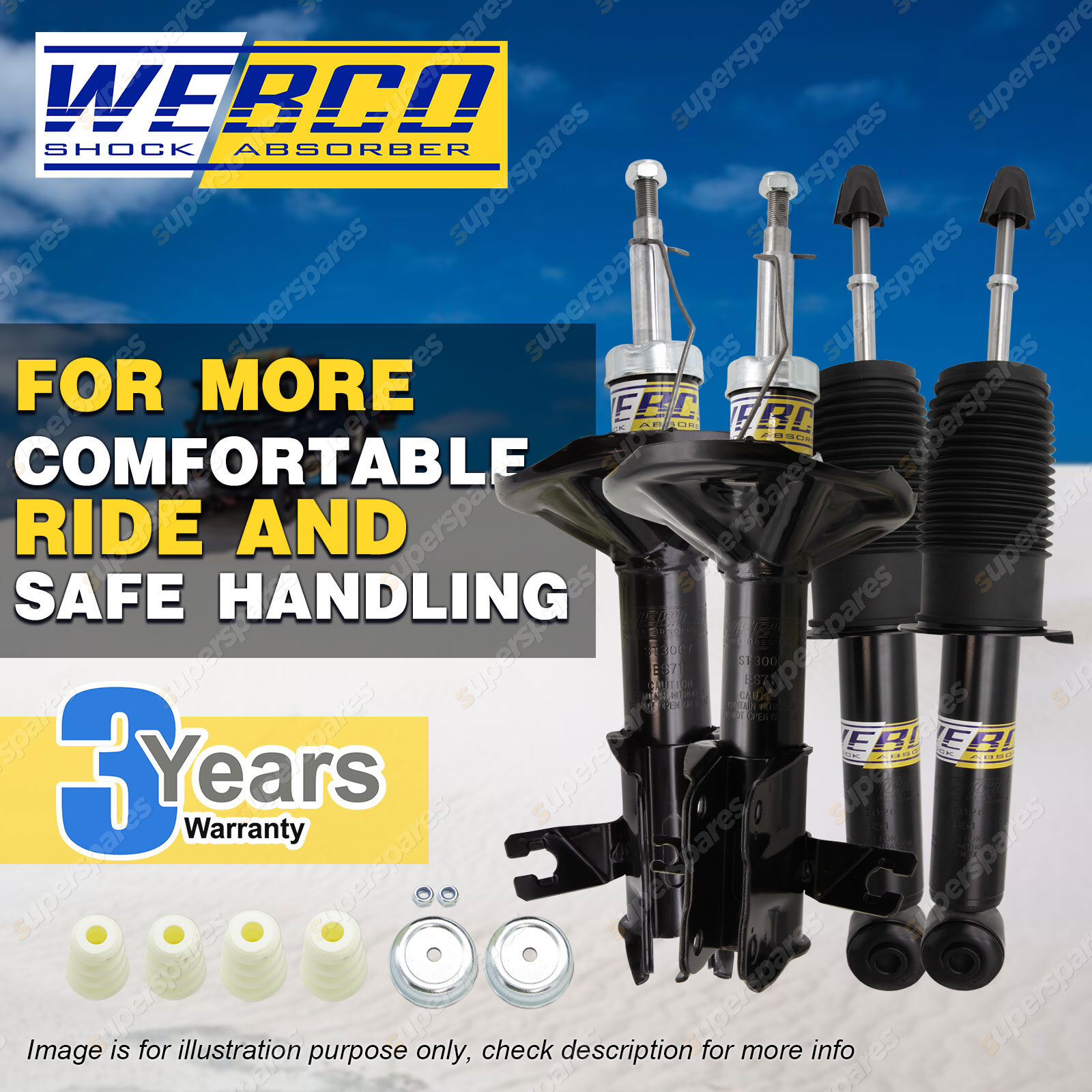 CONTENTS: 2 Pcs Front Webco Strut Shock Absorbers 2 Pcs Rear Webco Spring Seat Strut Shock Absorbers SUITS: MITSUBISHI LANCER CE Sedan & Coupe Jul-96 - Jul-02 (*please advise year model, so we can make sure send you the right parts) |