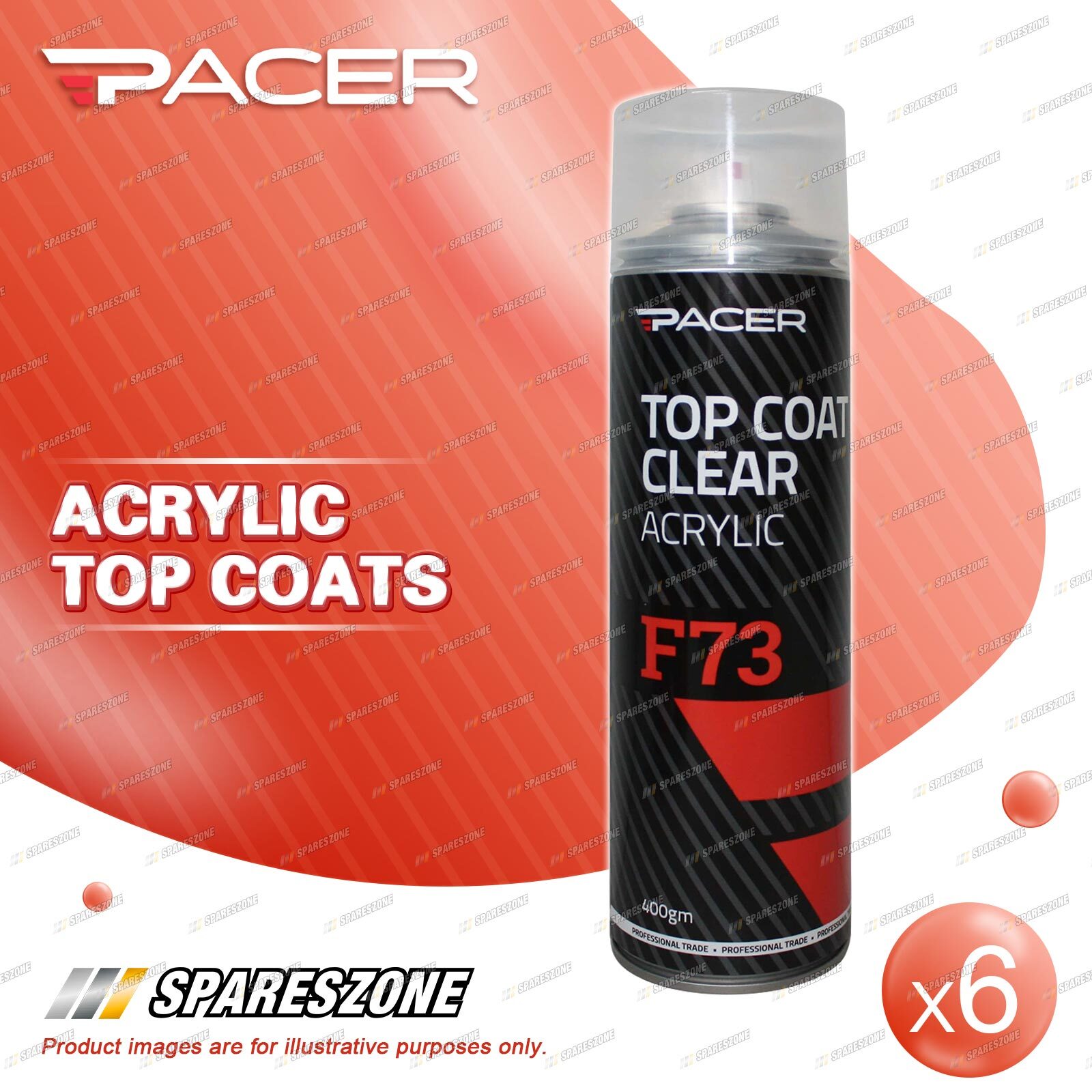 Contents : 6 x Pacer F73 Top Coat Clear Acrylic 400 Gram Aerosol