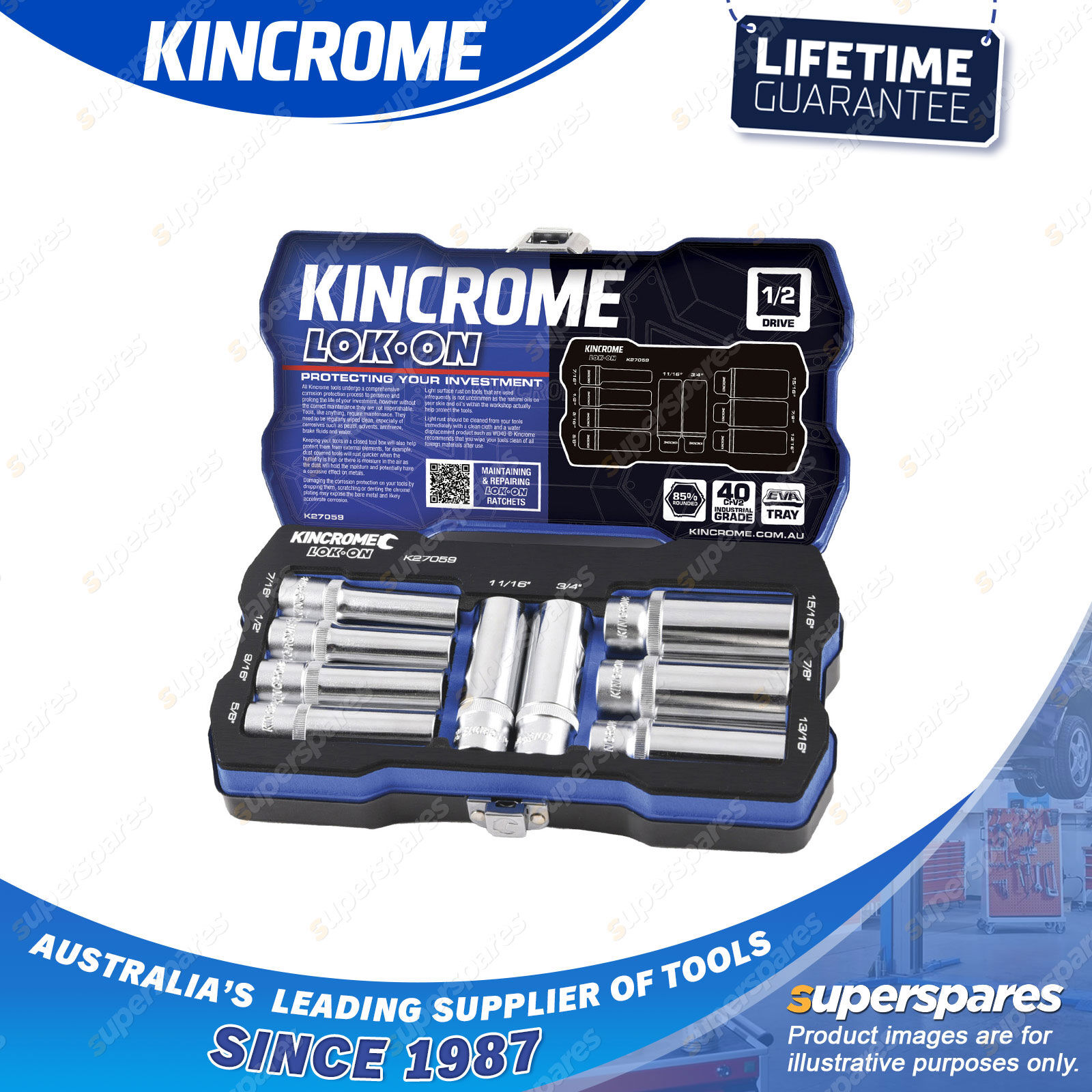 Contents : 9 Pcs of Kincrome 1/2" Drive LOK-ON Socket Set