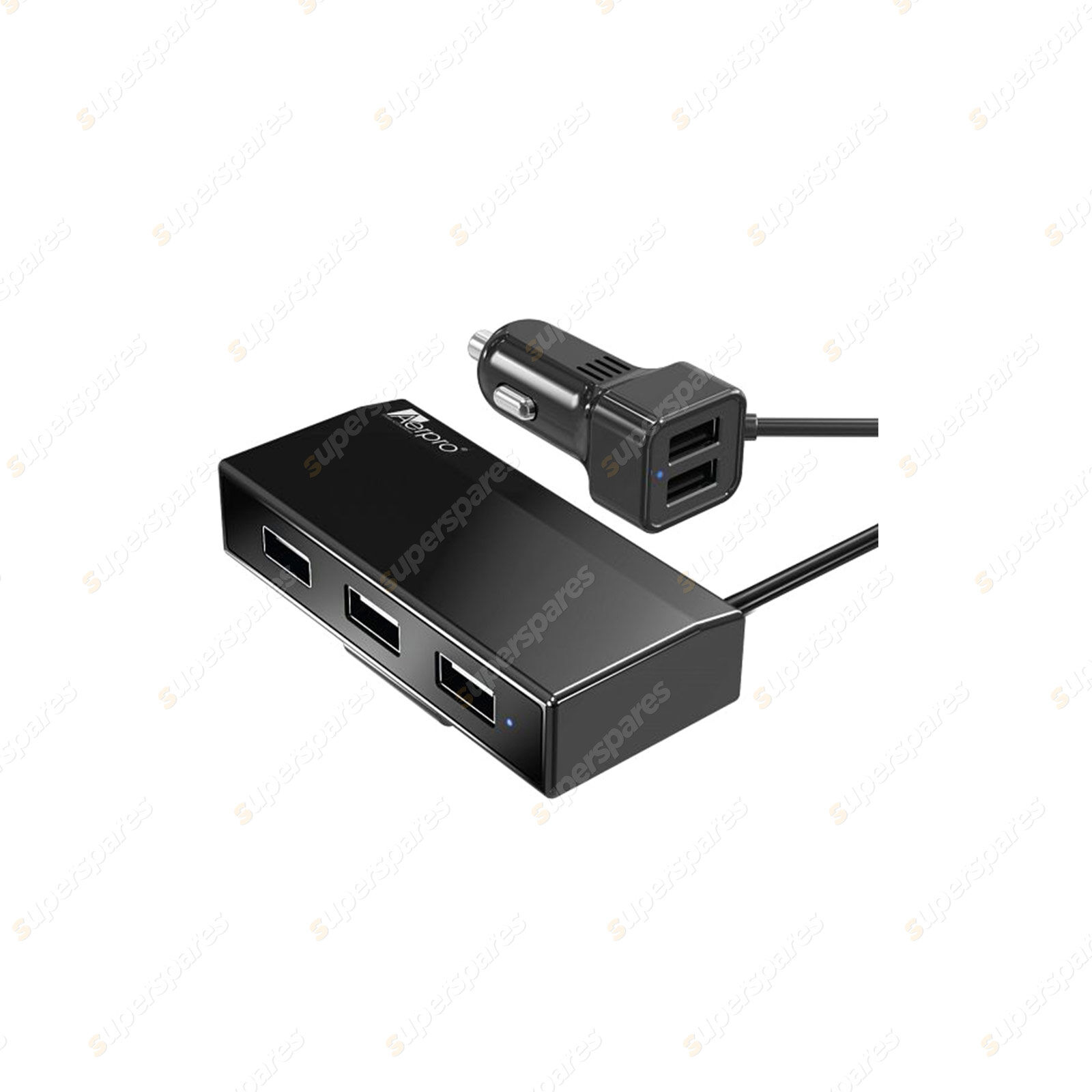 The Aerpro APCC500 9.6A Five Port USB In-Car Charger with 1.8m Cable allows you to conveniently charge your smartphone, tablet or other USB device right from the accessory socket in your vehicle. Featuring five USB ports, two 5V/2.4A (shared) USB-A ports in the front for driver and passenger devices and three 5V/2.4A (each) USB-A ports in the back for rear seat passengers, it is designed to charge up to five devices at a time. The 1.8M cable length allows the three port charging unit to be positioned virtually anywhere in the vehicle and it comes supplied with adhesive tape and rear seat mounting clip for simple installation. The gloss black finish with blue LED power indicator light presents a modern and stylish design that will suit the vehicle interior. This charger is 12/24V compatible, making it suitable for use in a wide range of vehicles including cars and trucks