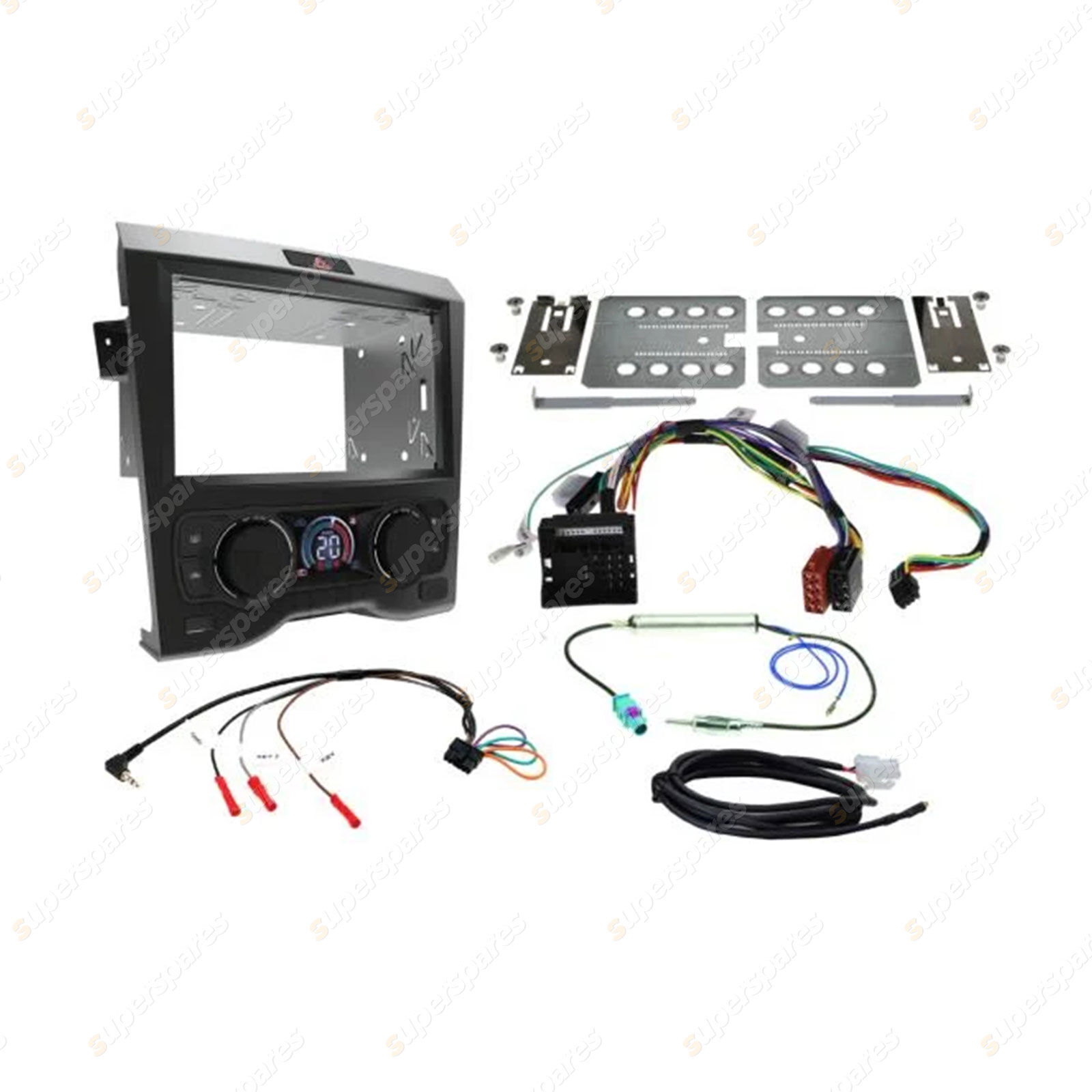 The Aerpro FP9355K Black Facia Kit is a comprehensive solution for upgrading the audio system in your Holden Commodore VE Series 1 (2006-2011). Designed specifically for models with single zone climate control, including Omega, V, Lumina, International, SV6, SS, and the 60th Anniversary Edition, this kit provides everything needed for a seamless double DIN headunit installation. The kit includes a facia kit with a built-in H-VAC controller and display, a steering wheel control interface, a mounting cradle, a vehicle-specific wiring loom, a remote temperature sensor, a universal patch lead, and an antenna adapter. With its high-quality black finish, it integrates perfectly with your vehicle's dashboard, retaining the steering wheel control functionality, including the phone button, and adding a sleek, modern touch.