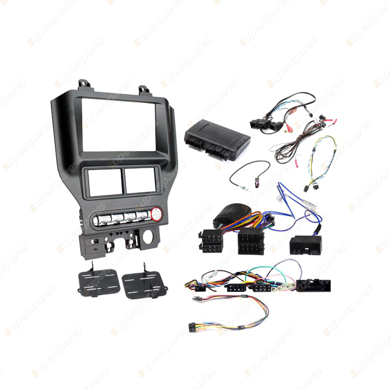 Complete a full aftermarket double din headunit installation in your Ford Mustang (2015-on), from start to finish with this Aerpro vehicle specific headunit installation kit, containing everything you need for a perfect upgrade in one box. This kit includes: gunmetal grey double din facia kit with advanced touch screen controls, mounting brackets, full vehicle integration interface, shaker audio retention harness, antenna adaptor and universal SWC patch lead. Installation of the aftermarket headunit is simplified even further when paired with the optional Aerpro APP9 Headunit Secondary ISO Harness & SWC Patch Lead, which connects between the aftermarket headunit and the Aerpro Steering Wheel Control Interface. The kit also replaces the HVAC control unit and retains; climate controls, steering wheel controls, heated seats (if equipped), OEM reverse camera & sensors (if equipped), OEM AUX input when connected to a compatible headunit and vehicle OE personalisation menus / settings. It accommodates the OEM toggle or OEM push button switches and is compatible with the OEM shaker audio system. The included vehicle interface also provides outputs for reverse trigger, park brake, speed pulse and telephone mute.