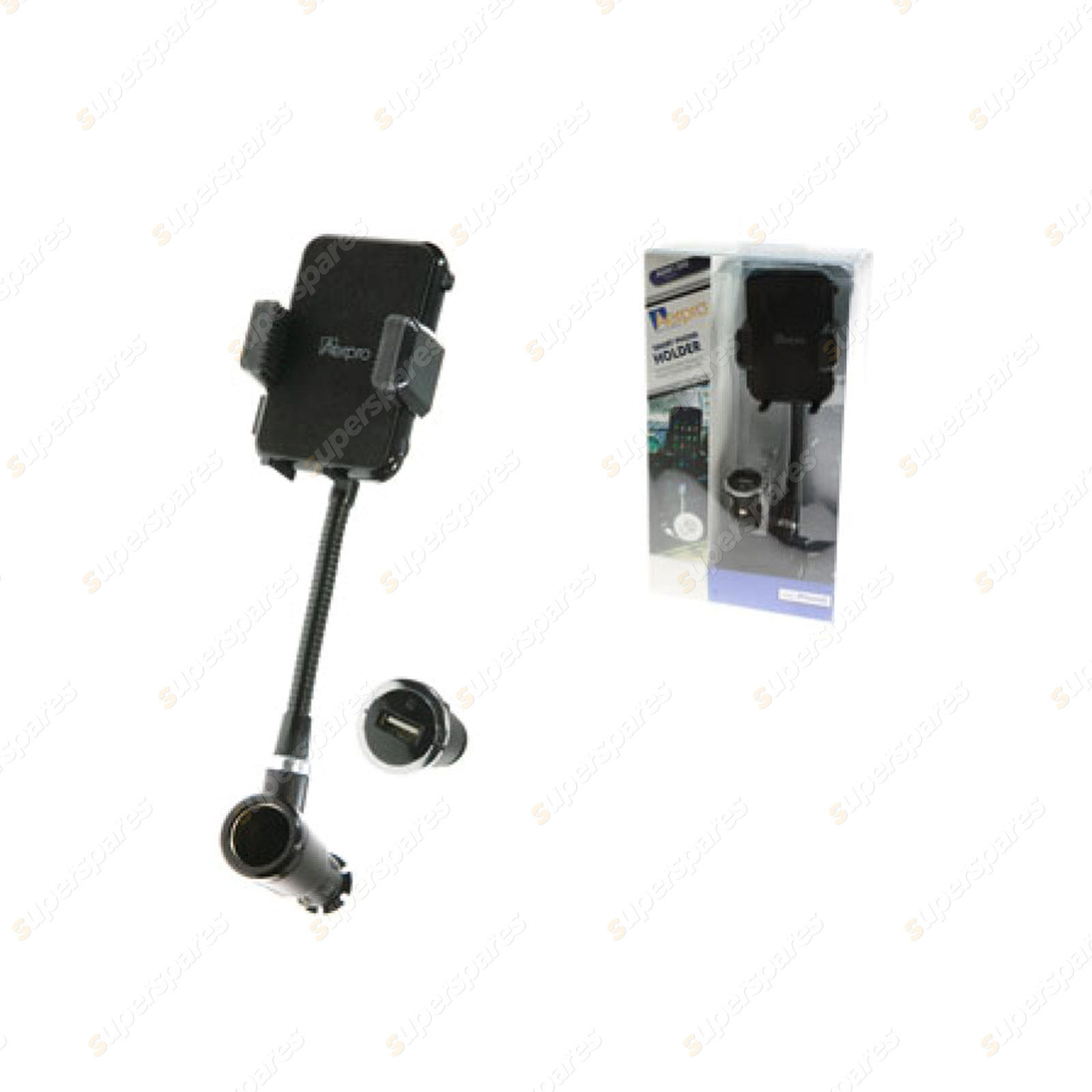 Phone holder to suit Android/Apple (including iPhone 5) with dual USB charge and power socket (Max. 3A)