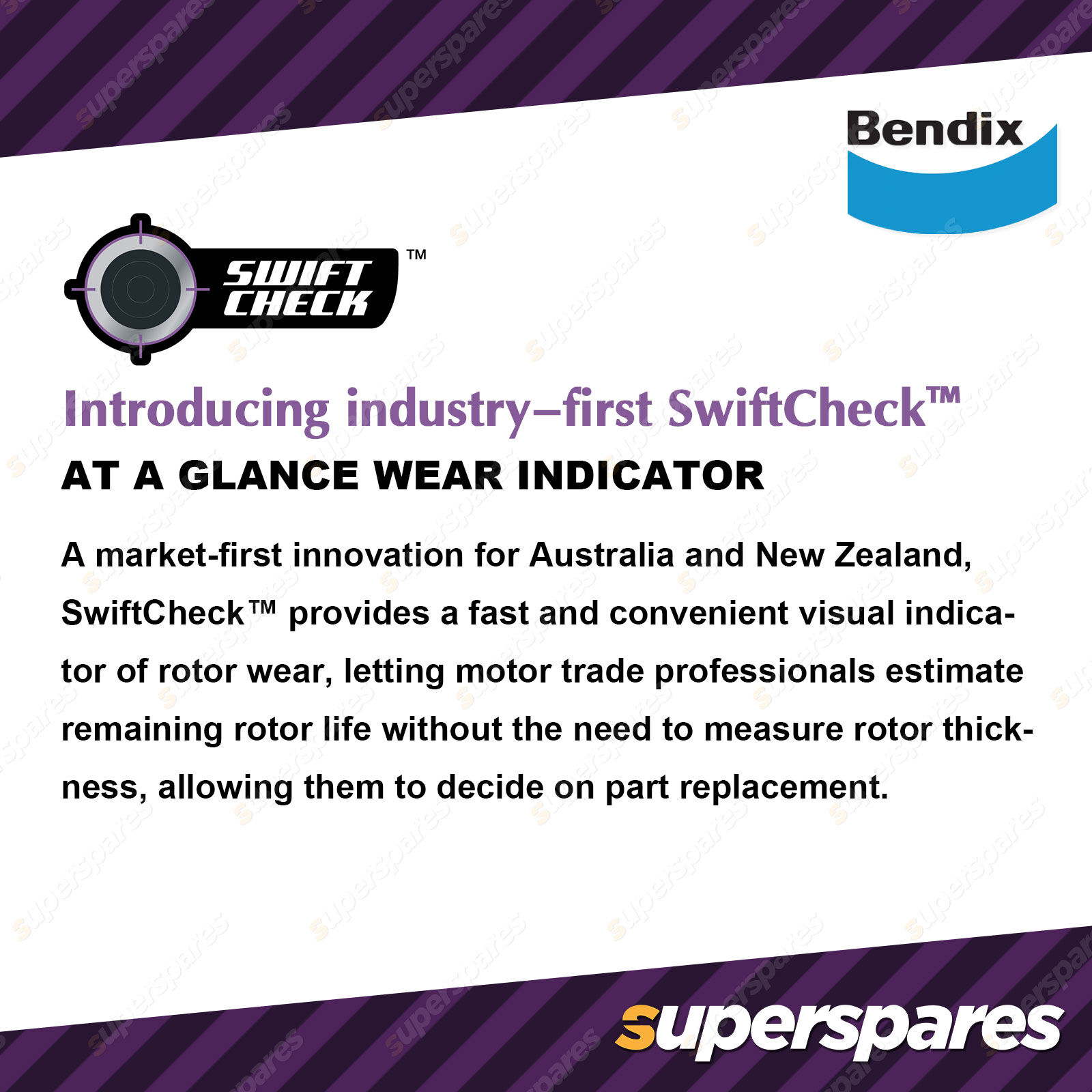 SwiftCheck™ is a machined feature that creates circular grooves on the rotor surface that narrow and disappear progressively as the rotor wears. Once the wear indicator displays a singular dot in the centre, this indicates it¡¯s time for the rotor to be changed. |