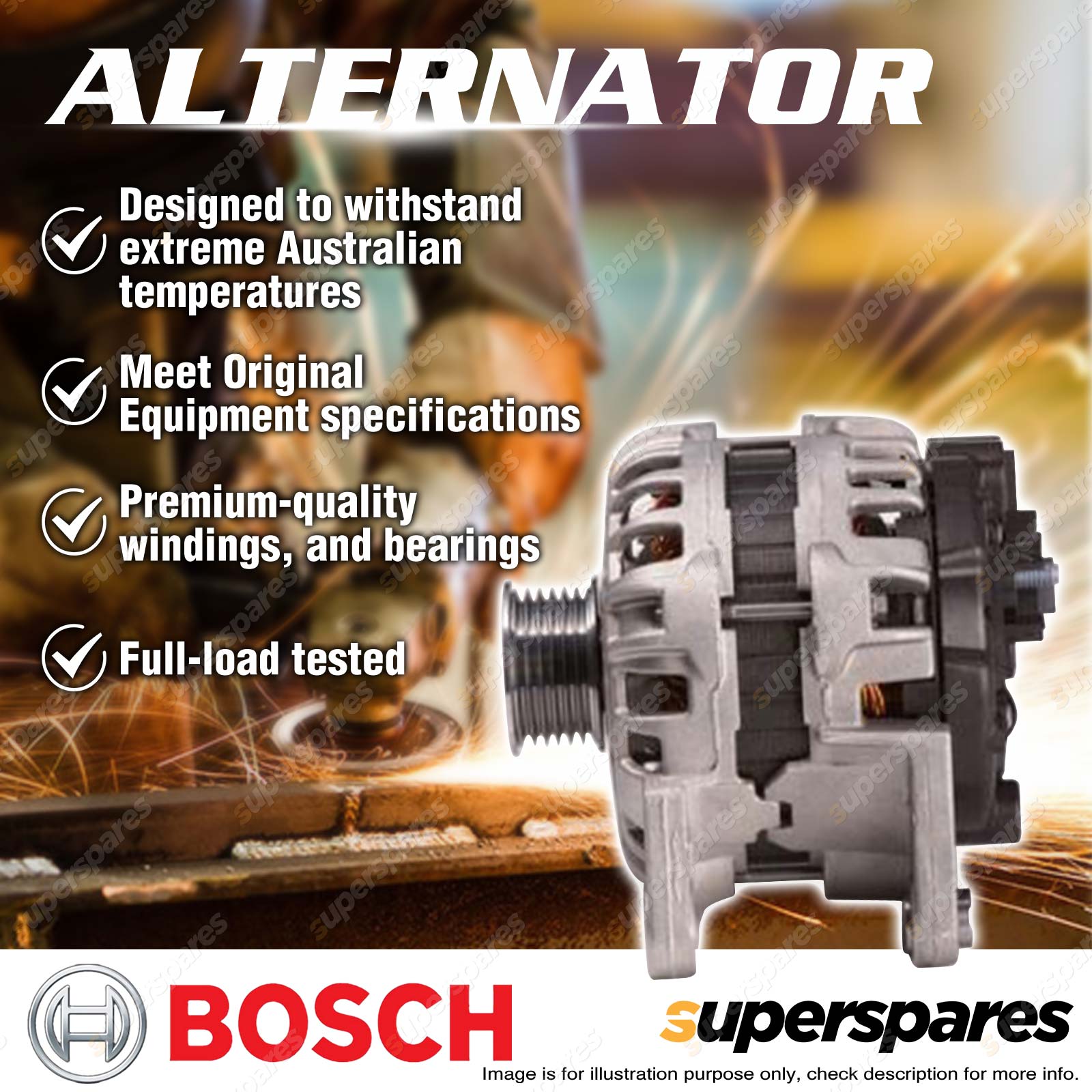 Bosch has been a major supplier of new alternators to Original Equipment vehicle manufacturers since 1913. Securing OE certification requires strict adherence to stringent precision and performance criteria. Bosch Premium Alternators are quality built and 100% factory tested to ensure years of reliable performance, even under the most extreme operating conditions. The warranty period for Bosch starter motors and alternators is as follows: Passenger vehicle applications - 24 months/40,000km |