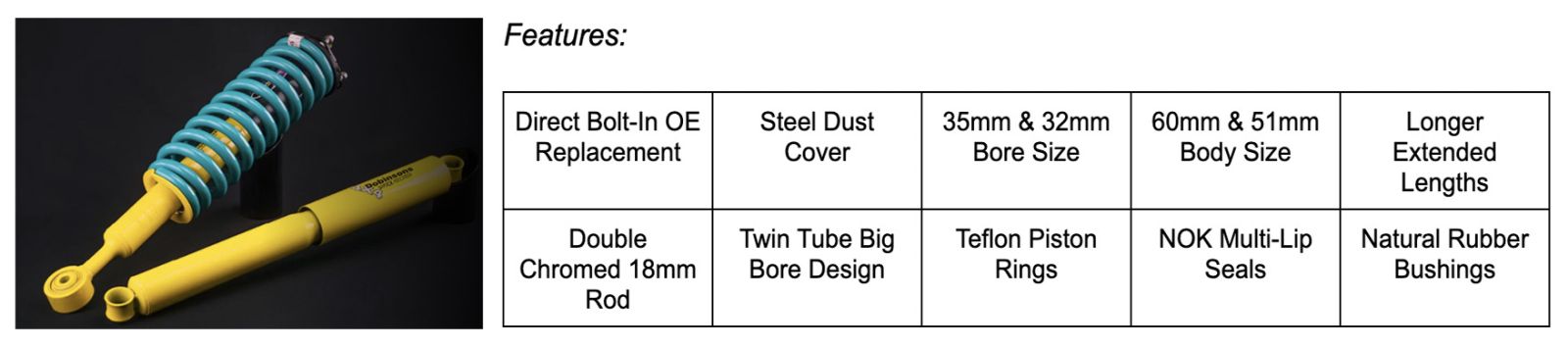 Where possible Dobinsons design each part number to provide a longer shock absorber for more wheel travel, firmer valving for a more controlled ride and a larger body with increased oil capacity for cooler operation than the original vehicle shock absorbers.