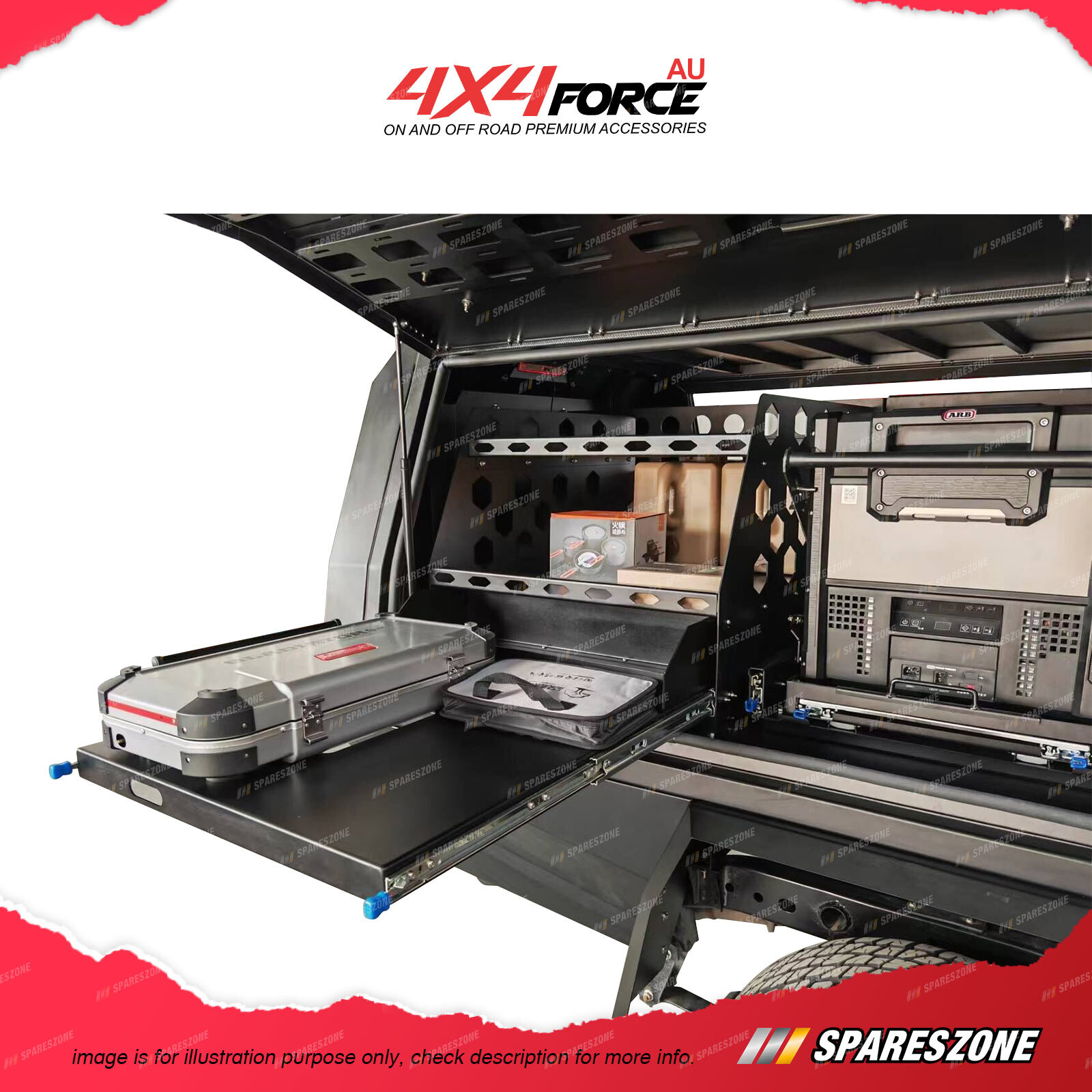 Tray Canopy with Dual Wheel Carrier 4X4FORCE Canopy is the perfect platform for those who need to fit large items or wish to develop their setup as they go. 4X4FORCE Ute Canopy are Made From 1mm-3mm heavy duty galvanized steel Plate to Prevent Rust and Corrosion, and field tested extensively to withstand harsh Australian conditions. Featuring Dual wheel Carrier you can ensure you'll always make it to where you need to go. Features: