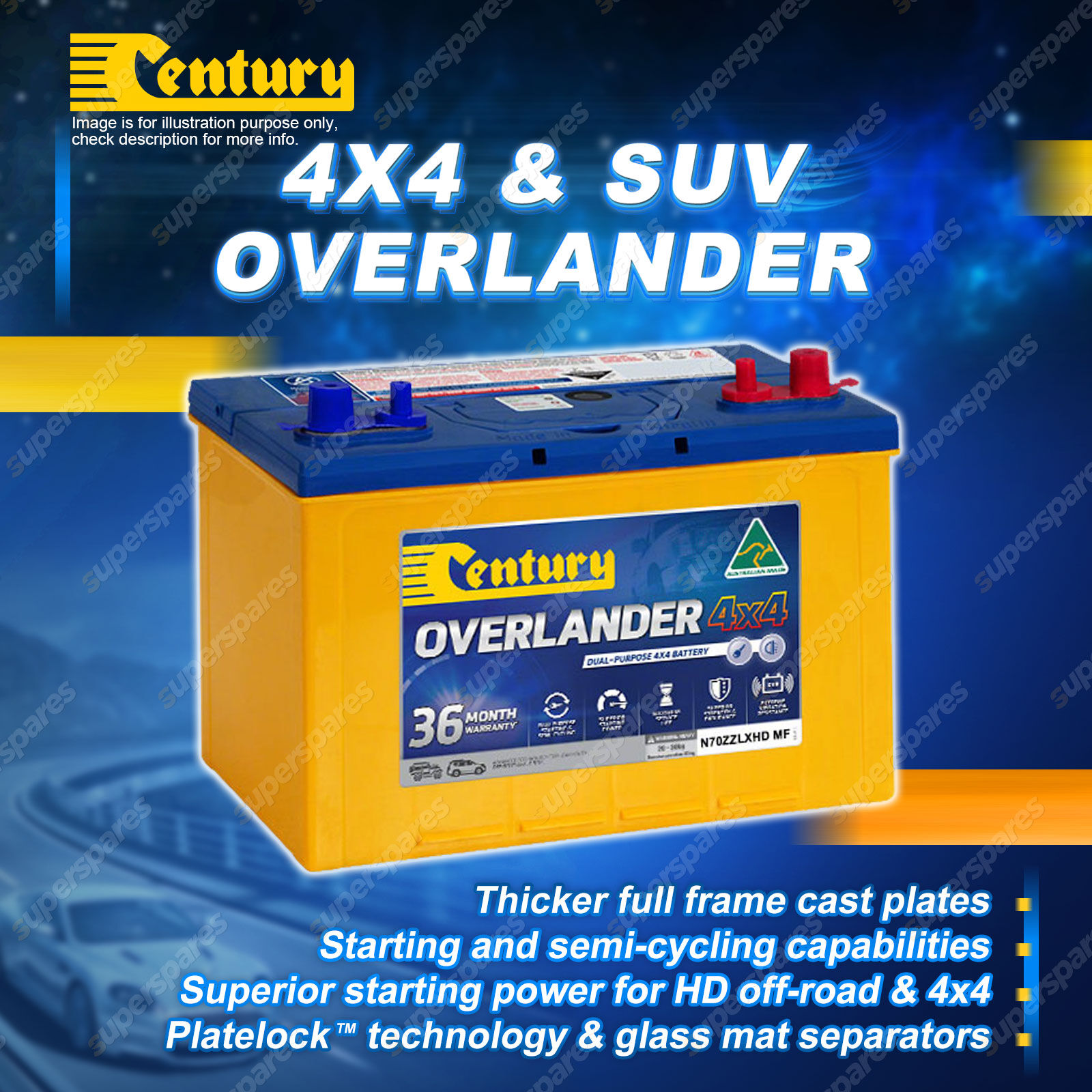 Overlander 4x4 Century Overlander 4x4 batteries are designed to handle it all ¨C from touring 4x4's which stay on sealed roads, all the way through to purpose-built weekend off-road warriors. Designed and built in Australia to withstand the punishment of our extreme climate and harsh off-road conditions, Century's Overlander 4x4 is a dual-purpose battery ¨C providing superior starting power and semi-cycling capabilities to power aftermarket vehicle accessories.
