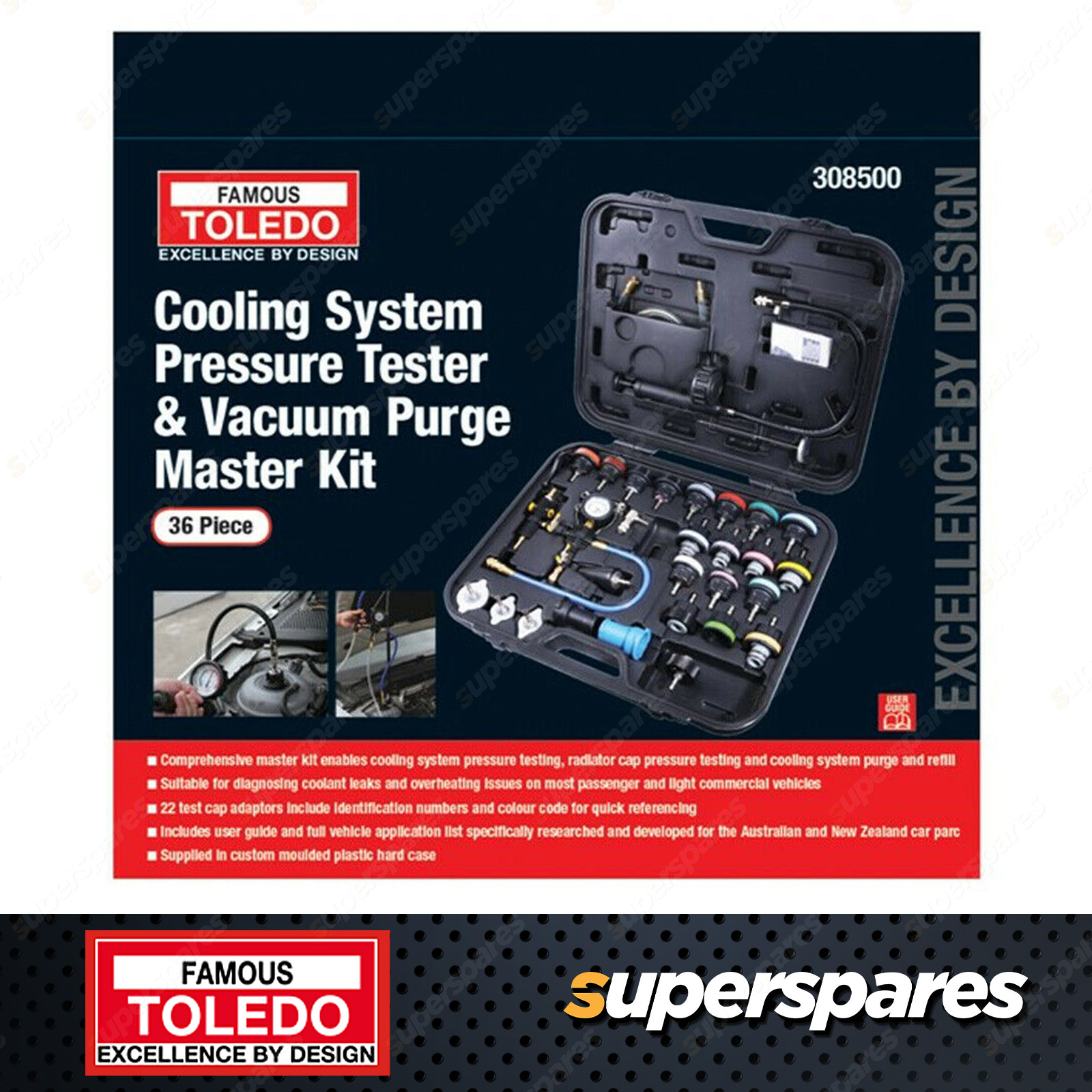 Toledo Cooling System Pressure Tester & Vacuum Purge 36pc Master Kit Comprehensive master kit enables cooling system pressure testing, radiator cap pressure testing and cooling system purge and refill Vacuum purge allows the evacuation of air pockets in cooling system after service or repairs Suitable for diagnosing coolant leaks and overheating issues on most passenger and light commercial vehicles Large easy to read colour coded dials for accuracy 22 test cap adaptors include identification numbers and colour code for quick referencing 90 elbow adaptor suitable for difficult or obscure positions Handy thermometer for checking heater and air conditioning temperature after service or repair Universal tapered cone adaptor enables testing on plant and agriculture machinery Includes user guide and full vehicle application list covering 95% of AUS/NZ Car parc Supplied in heavy duty storage case