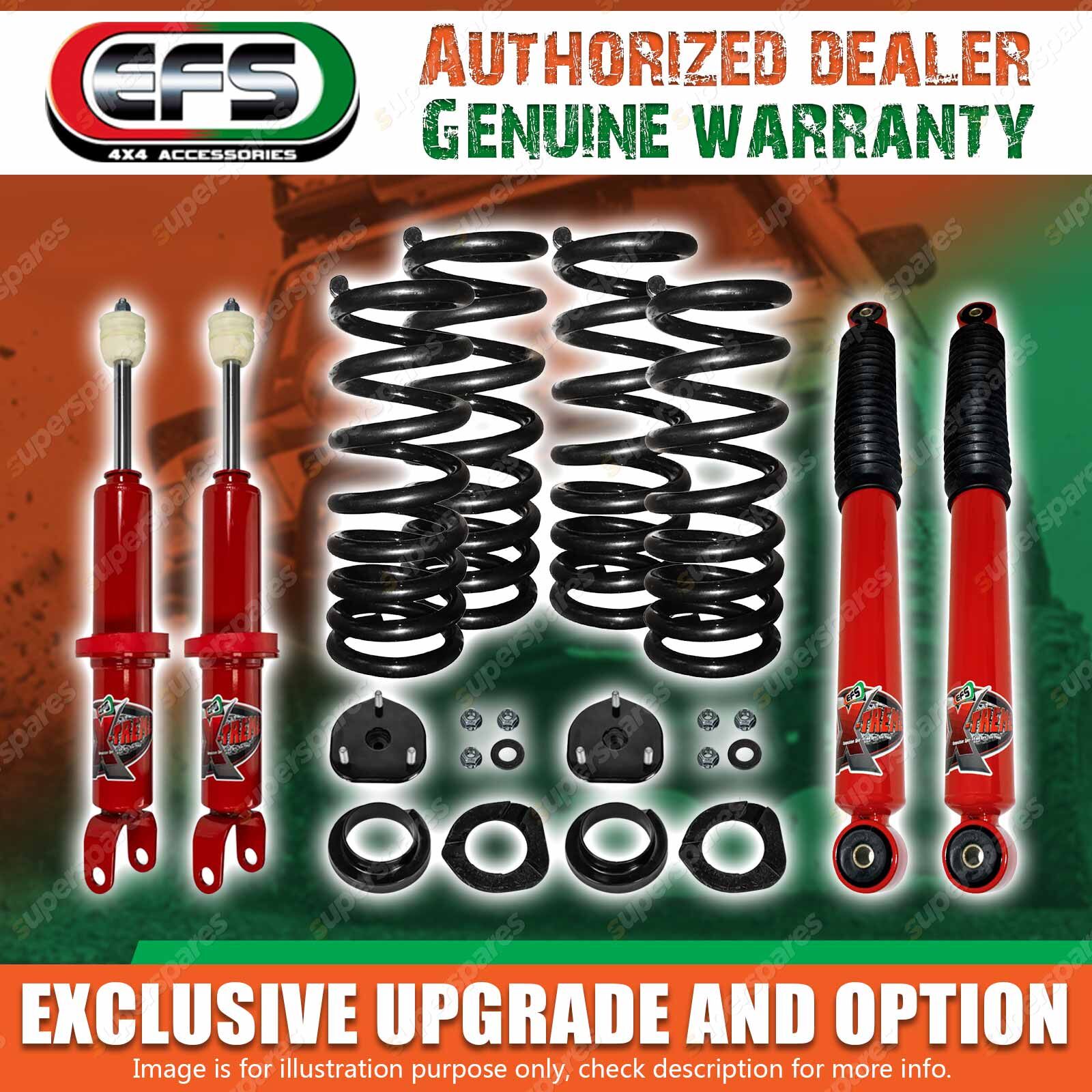 EFS Coil Springs EFS Coil Springs are produced in a variety of raised heights, from standard to 125mm & also a variety of spring rates to suit different applications - towing, load bearing, ride height & competition. * Shot Peened - To stress relieve the outer surface of the Coil, so the Coil can operate under higher fatigue & repeated load conditions to ensure longevity. * Scragged for Quality Control -This is a process where the Coil is compressed beyond its yield point; this compression will set-up residual stresses and increase the elastic limit of the spring. * Powder Coated - To resist corrosion & to protect the spring steel from minor damage. | ![]() |