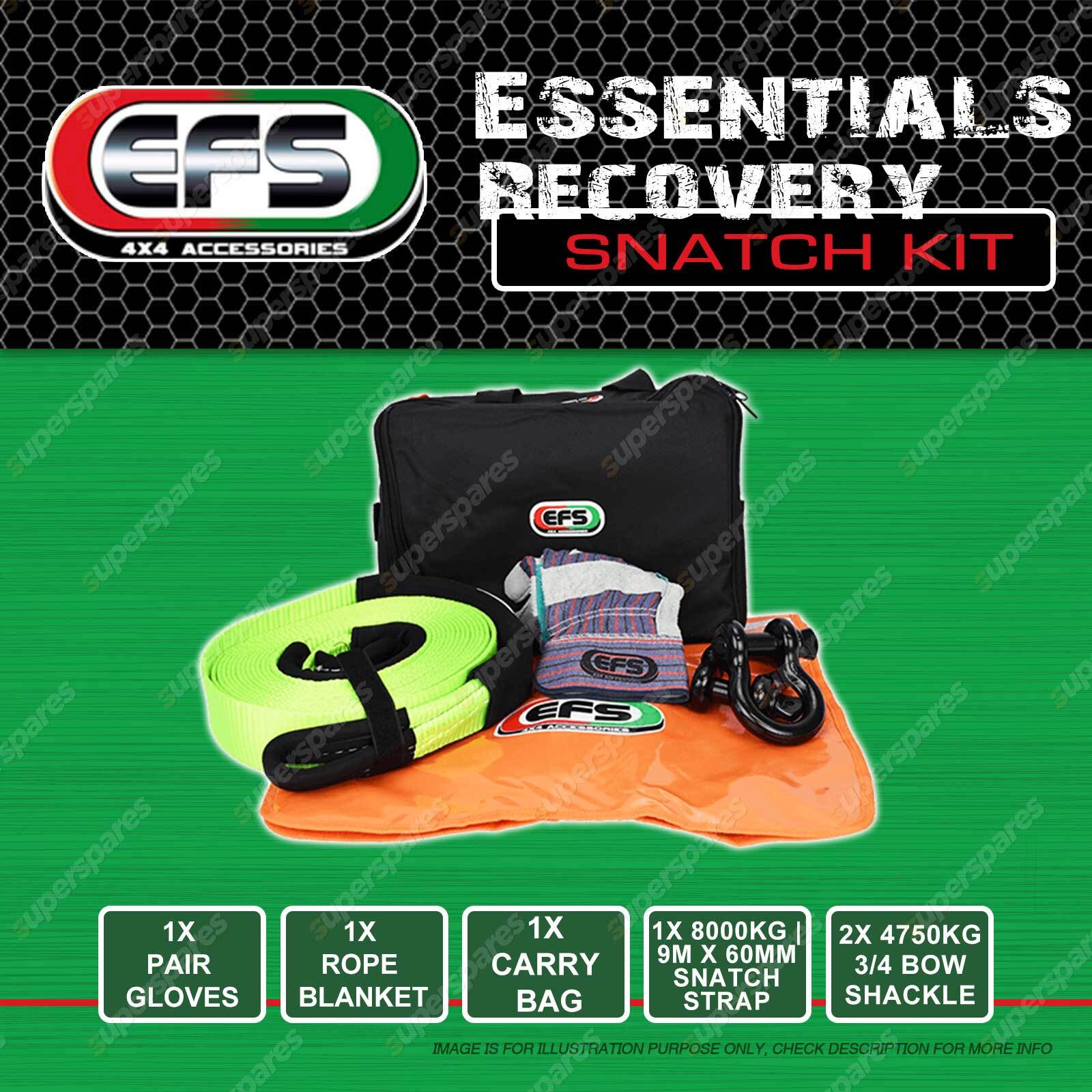 Contents: EFS Essentials Recovery Snatch Kit 4750kg 3/4 Bow Shackle 9m x 60mm snatch strap |