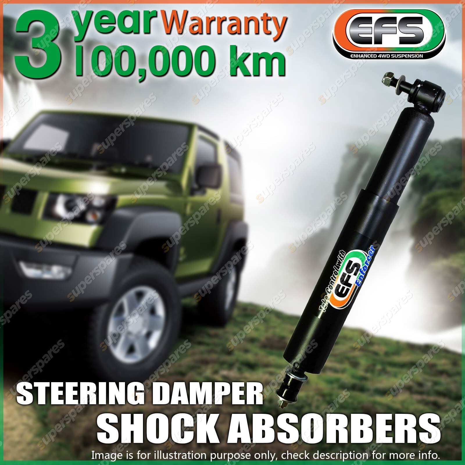 Enforcer Steering Damper The EFS Enforcer Steering Damper increases the control over bumper steer & improves steering control suited from standard to 33 inch tyres. Featuring 32mm twin tube, 11mm or 12mm hardened chrome piston rod, metal dust cover & gas cell technology. | X-Treme Steering Damper The EFS X-Treme Steering Damper will provide unmatched steering control and reliability. Designed with increased valve forces to aid in the control of oversized tyres that increase bump steer. Features 35mm bore, oversized 60mm body, 16mm hardened chrome shaft & increased valve forces to suit 33 - 37 inch tyres.