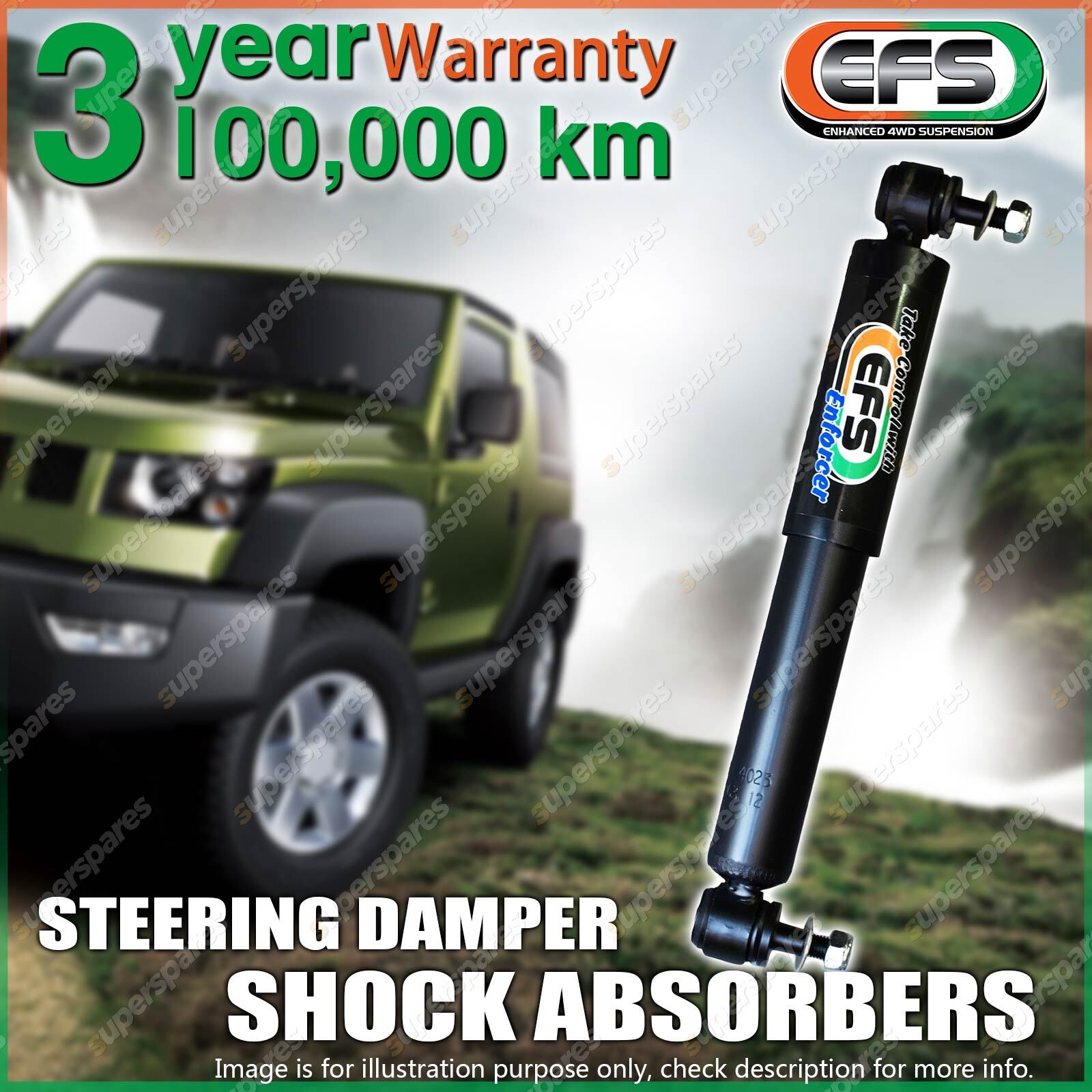 Enforcer Steering Damper The EFS Enforcer Steering Damper increases the control over bumper steer & improves steering control suited from standard to 33 inch tyres. Featuring 32mm twin tube, 11mm or 12mm hardened chrome piston rod, metal dust cover & gas cell technology. | X-Treme Steering Damper The EFS X-Treme Steering Damper will provide unmatched steering control and reliability. Designed with increased valve forces to aid in the control of oversized tyres that increase bump steer. Features 35mm bore, oversized 60mm body, 16mm hardened chrome shaft & increased valve forces to suit 33 - 37 inch tyres.