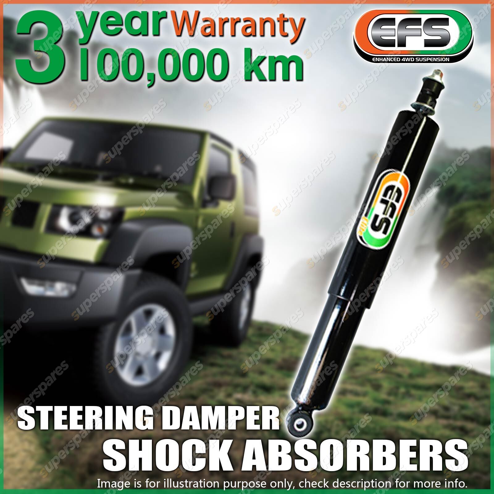 Enforcer Steering Damper The EFS Enforcer Steering Damper increases the control over bumper steer & improves steering control suited from standard to 33 inch tyres. Featuring 32mm twin tube, 11mm or 12mm hardened chrome piston rod, metal dust cover & gas cell technology. | X-Treme Steering Damper The EFS X-Treme Steering Damper will provide unmatched steering control and reliability. Designed with increased valve forces to aid in the control of oversized tyres that increase bump steer. Features 35mm bore, oversized 60mm body, 16mm hardened chrome shaft & increased valve forces to suit 33 - 37 inch tyres.