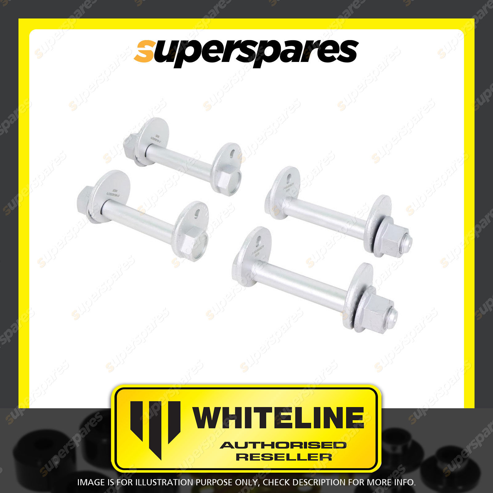 | Contents : Whiteline Front Control Arm Lower - Inner Camber Bolt Kit Warranty : Lifetime Kit Contents : 4 Bolts, 4 Washers, 4 Nuts |