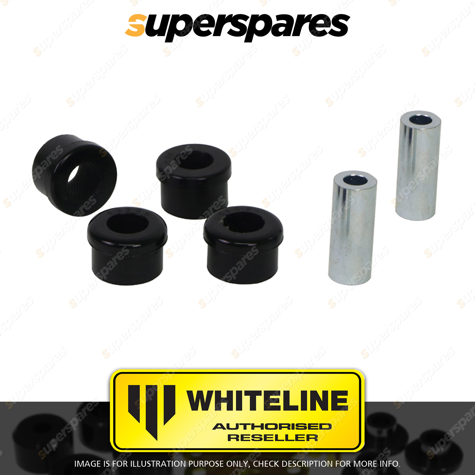 | Contents : Whiteline Front Control arm - lower inner Front bushing Warranty : 3 Year / 60,000Kms Kit Contents : 4 Bushings, 2 Tubes, Grease |