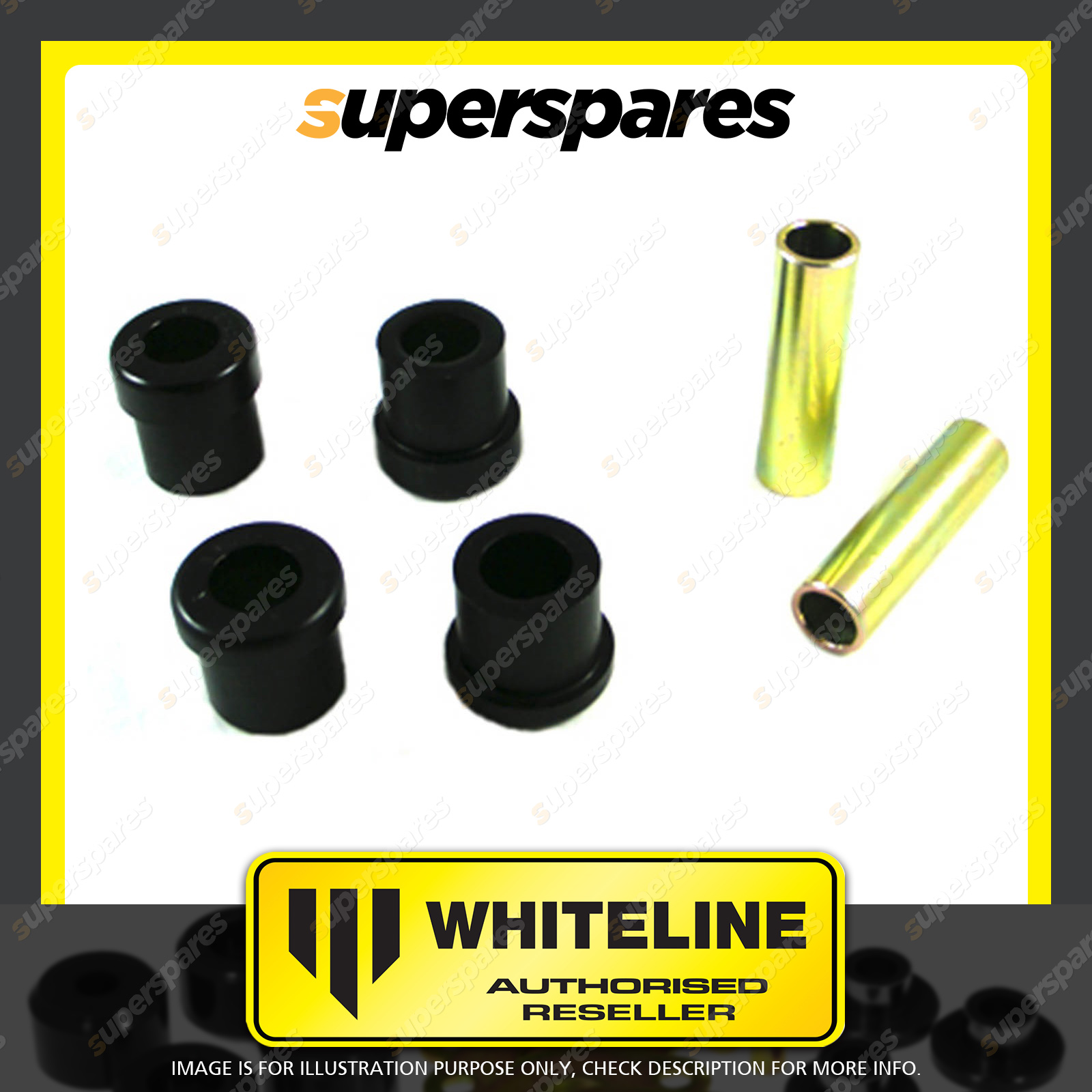 | Contents : Whiteline Front Control arm - lower inner Rear bushing Warranty : 3 Year / 60,000Kms Kit Contents : 4 Bushings, 2 Tubes, Install Guide, Grease |