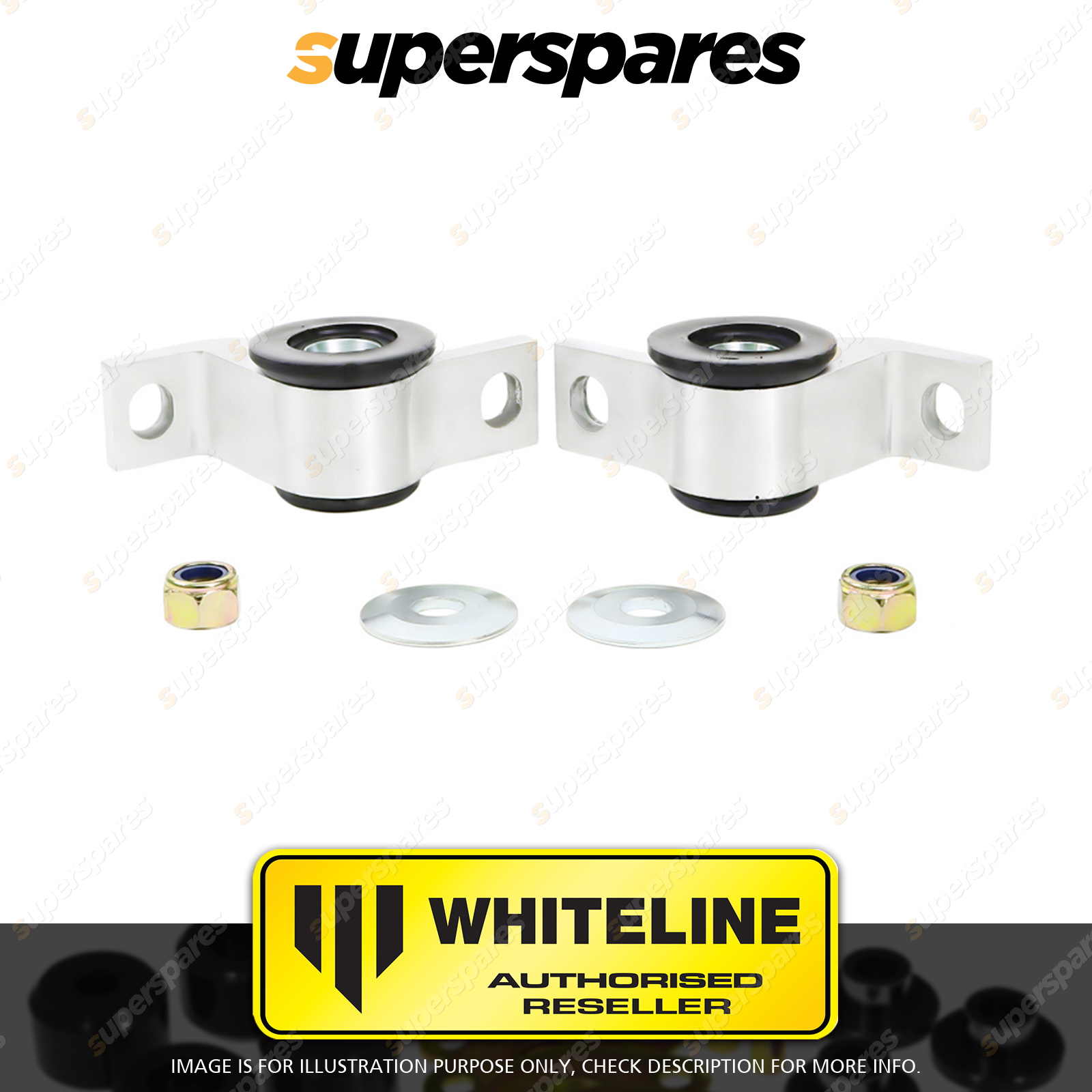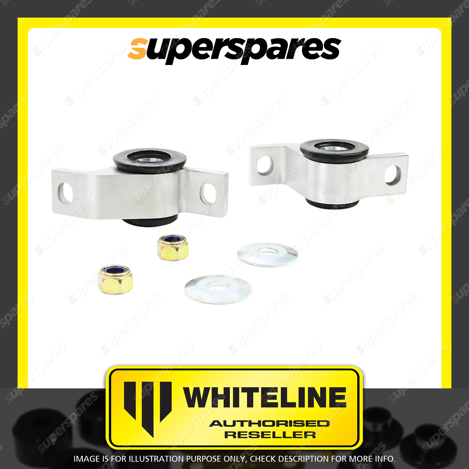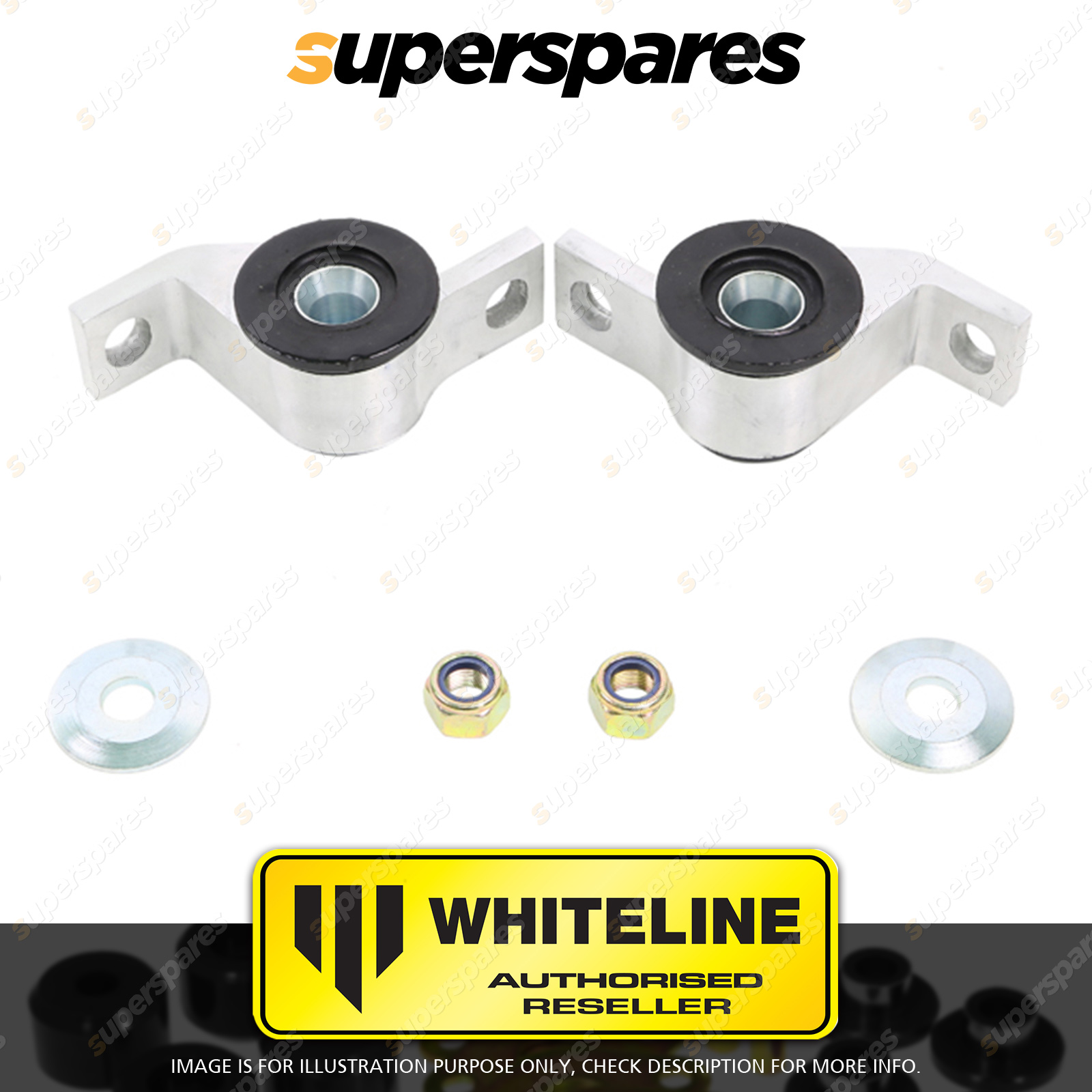 | Contents : Whiteline Front Control arm - lower inner Rear bushing Warranty : 3 Year / 60,000Kms Kit Contents : 2 Housings, 2 Washers, 2 Nuts, Install Guide, Grease | Kit Specifications : Alignment Type : Anti Lift / Caster |