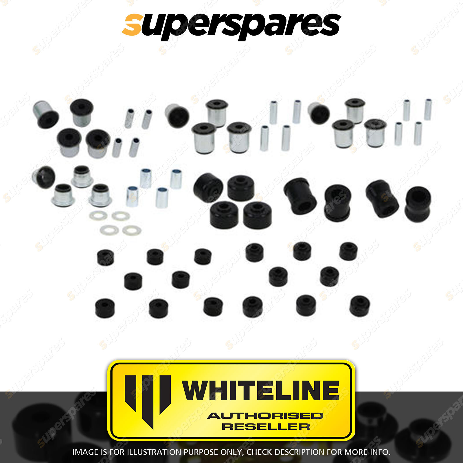 Contents : Essential Vehicle Kit Position : Front and Rear Warranty : Lifetime Kit Contents : 16 Shell Bushings, 28 Bushings, 16 Tubes, 4 Washers, Grease |