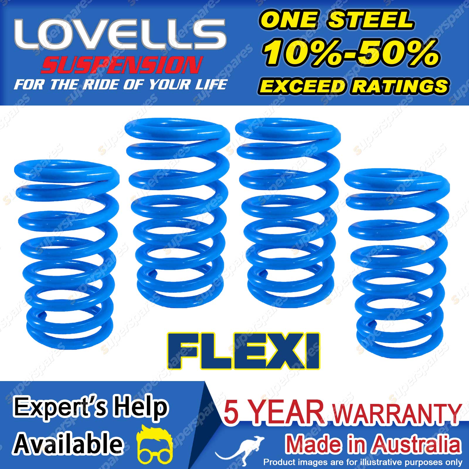1.SUPERIOR PERFORMANCE REPLACEMENTS FOR MASSPRODUCED O.E. (ORIGINAL EQUIPMENT) COIL SPRINGS 2.EXCEED ORIGINAL RATINGS BY 10% TO 50% (DEPENDING ON THE APPLICATION) 3.MANUFACTURED TO THE HIGHEST STANDARD IN AUSTRALIAN-MADE ONESTEEL MICRO ALLOY STEEL 4.PROGRESSIVE RATE DESIGN ENABLES THE SPRING TO INCREASE IN SPRING RATE WHEN YOU NEED IT AND DECREASE WHEN YOU DON'T |