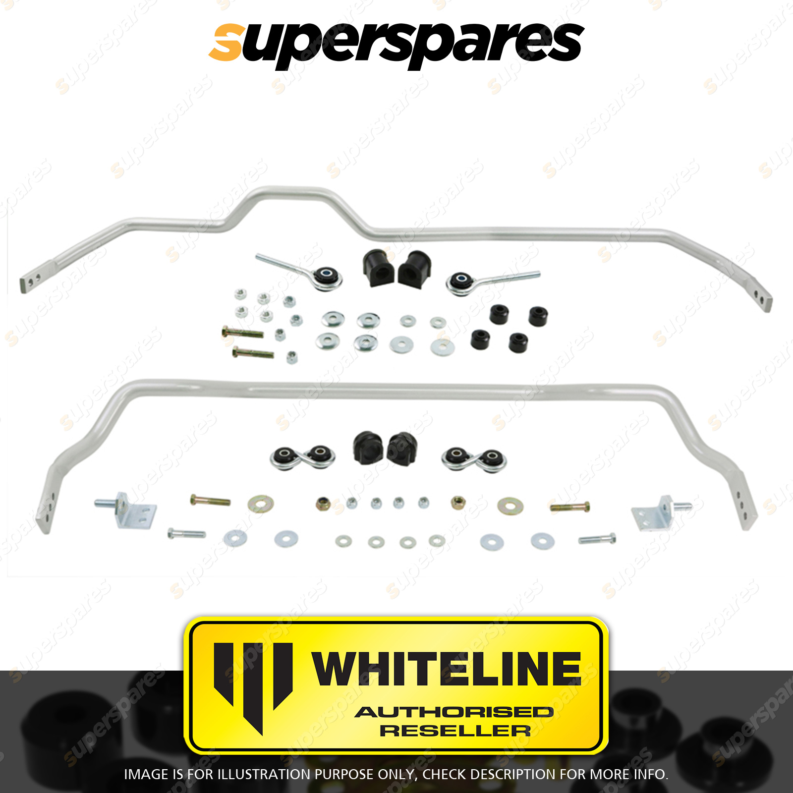 | Contents : Whiteline F and R Sway bar - vehicle kit Warranty : 3 Year / 60,000Kms Kit Contents : 2 Sway Bars, 4 Links, 8 Bushings, 2 Brackets, 6 Bolts, 18 Washers, 14 Nuts, Install Guide, Grease |