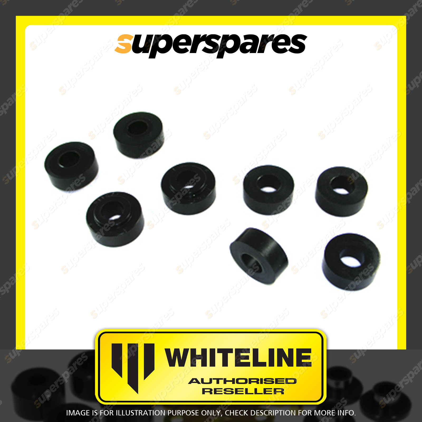| Contents : Whiteline Front Subframe - mount bushing Warranty : 3 Year / 60,000Kms Kit Contents : 8 Bushings |