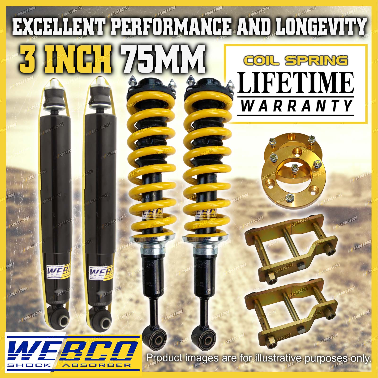 | As car enthusiasts ourselves we completely understand the need for only wanting the best top quality aftermarket parts for your vehicle from a reliable and trustworthy source. We have utilised our understanding of this need to develop the best quality lift kits and build strong relationships with out valued customers; here's how... eBay have listed us as a "Top Rated Seller" with a 99.4% Positive feedback rating. We also offer a 30 day change of mind return period with a 100% fitment guarantee to ensure your peace of mind. Spareszone's lift kits offer an immense improvement in suspension performance and comfortability when compared to the standard stock suspension of your vehicle giving our customers a greater driving experience on and off road. | ||